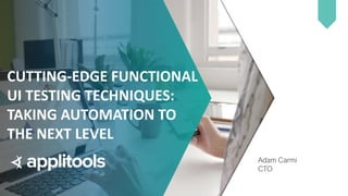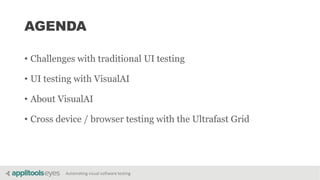 The document discusses advancements in automating visual software testing, emphasizing the limitations of traditional UI testing and the advantages of using VisualAI for improved functional coverage. It outlines the benefits of a new Ultrafast Grid for cross-device testing, which accelerates test implementation, reduces code complexity, and enhances stability while addressing security concerns. The solution aims to significantly improve test coverage and efficiency, ultimately leading to faster release cycles and reduced costs.