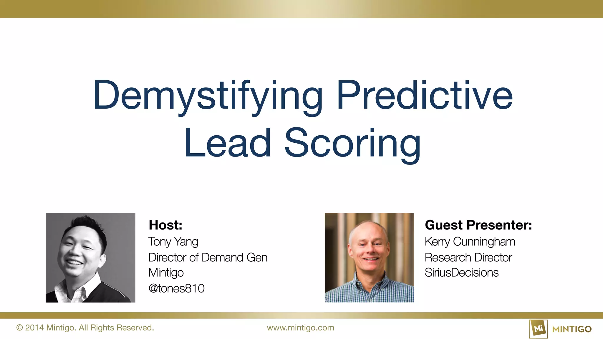 This webinar led by Tony Yang and featuring guest presenter Kerry Cunningham focuses on demystifying predictive lead scoring, covering its evolution and key considerations for implementing a program. It highlights the shortcomings of current lead scoring methods and introduces the potential of big data and data science for deeper qualification of leads. Key takeaways include the importance of understanding past behavior for future predictions and the necessity of utilizing larger, more reliable data sets.