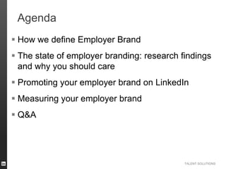 The document discusses the importance of employer branding for talent acquisition leaders, highlighting its significant impact on hiring success and the growing investment by companies. It outlines the definition of employer branding, effective promotional channels, and the need for strategic approaches and metrics in measuring brand strength. Despite recognizing its value, many organizations lack a proactive strategy and fail to consistently measure their employer brand's effectiveness.