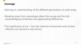 The document discusses strategies for engaging a multi-generational workforce, emphasizing the importance of understanding generational dynamics and breaking stereotypes. It highlights the need for organizations to foster authentic workplaces, promote continuous learning, and leverage coaching to develop leadership skills across different age groups. Additionally, it advocates for cultural transformation through collaboration and innovation to enhance employee motivation and effectiveness.