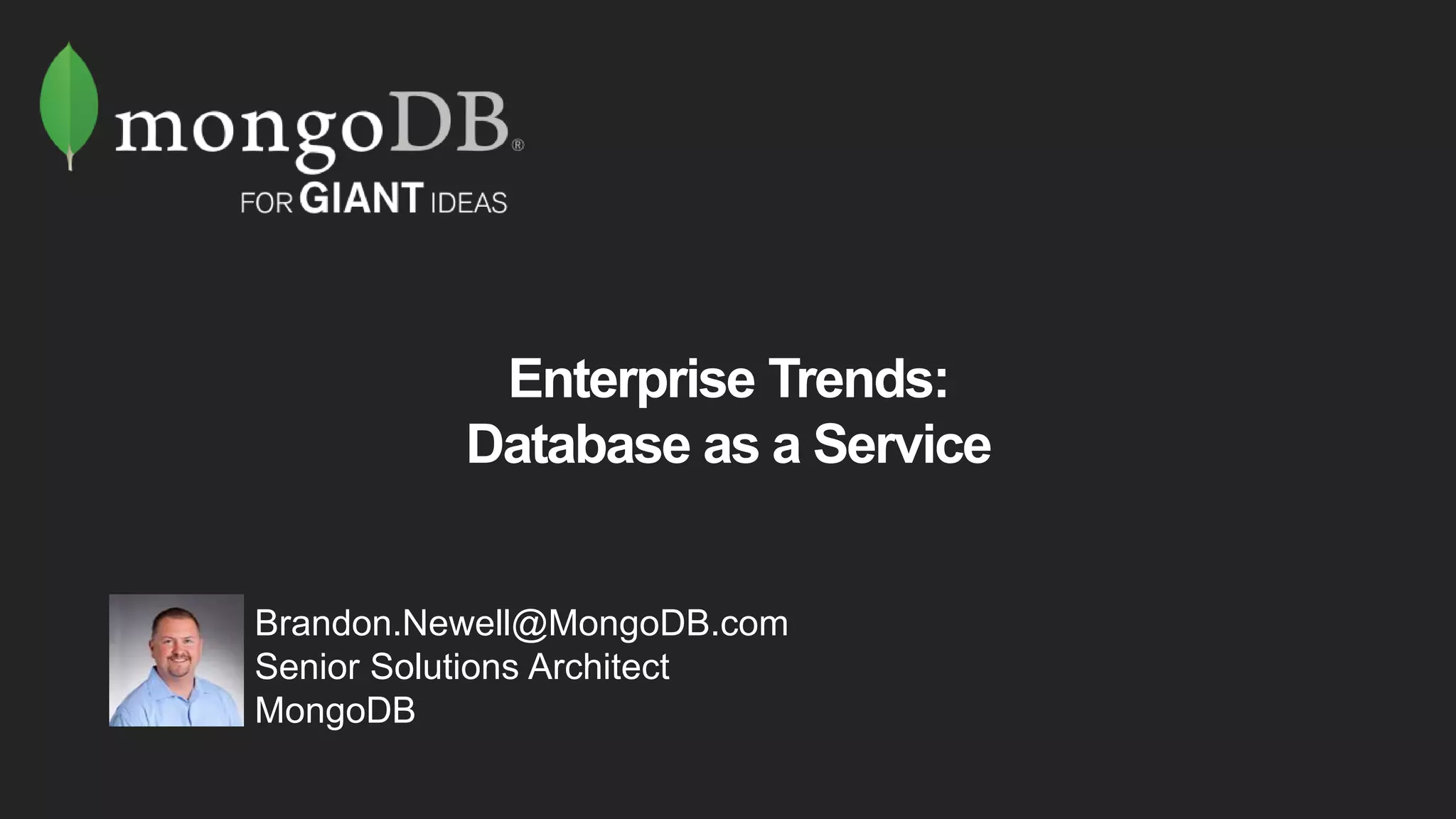 The document discusses the advantages and implementation of Database as a Service (DBaaS) in enterprise architecture, particularly focusing on MongoDB as a service. It highlights the benefits of agility, scalability, and efficiency while addressing risks and best practices for successful adoption. The document also presents case studies from organizations like the U.S. Department of Veterans Affairs and Goldman Sachs that utilize MongoDB services.