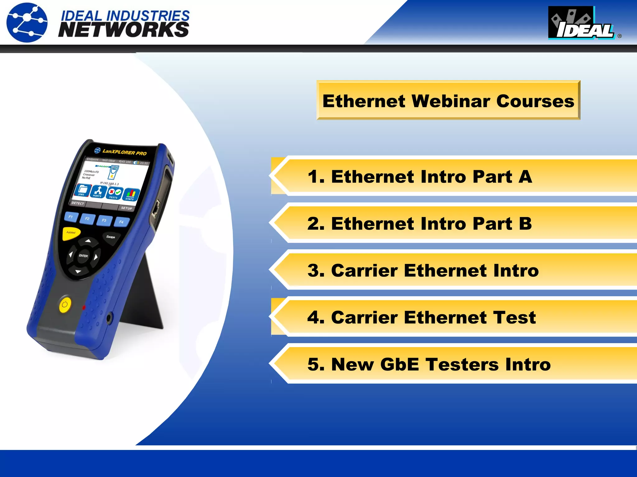 1. It introduces five Ethernet webinar courses that will be covered, including Ethernet introductions, Carrier Ethernet introductions, and introductions to new Gigabit Ethernet testers.
