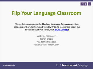 The document outlines a webinar series on flipping language classrooms, including the concept, benefits, and best practices for implementing this teaching method. It emphasizes increasing student engagement through interactive learning and offers resources and tools from Transparent Language to assist educators. The presentation also addresses common misconceptions about flipped learning and potential pitfalls to avoid.