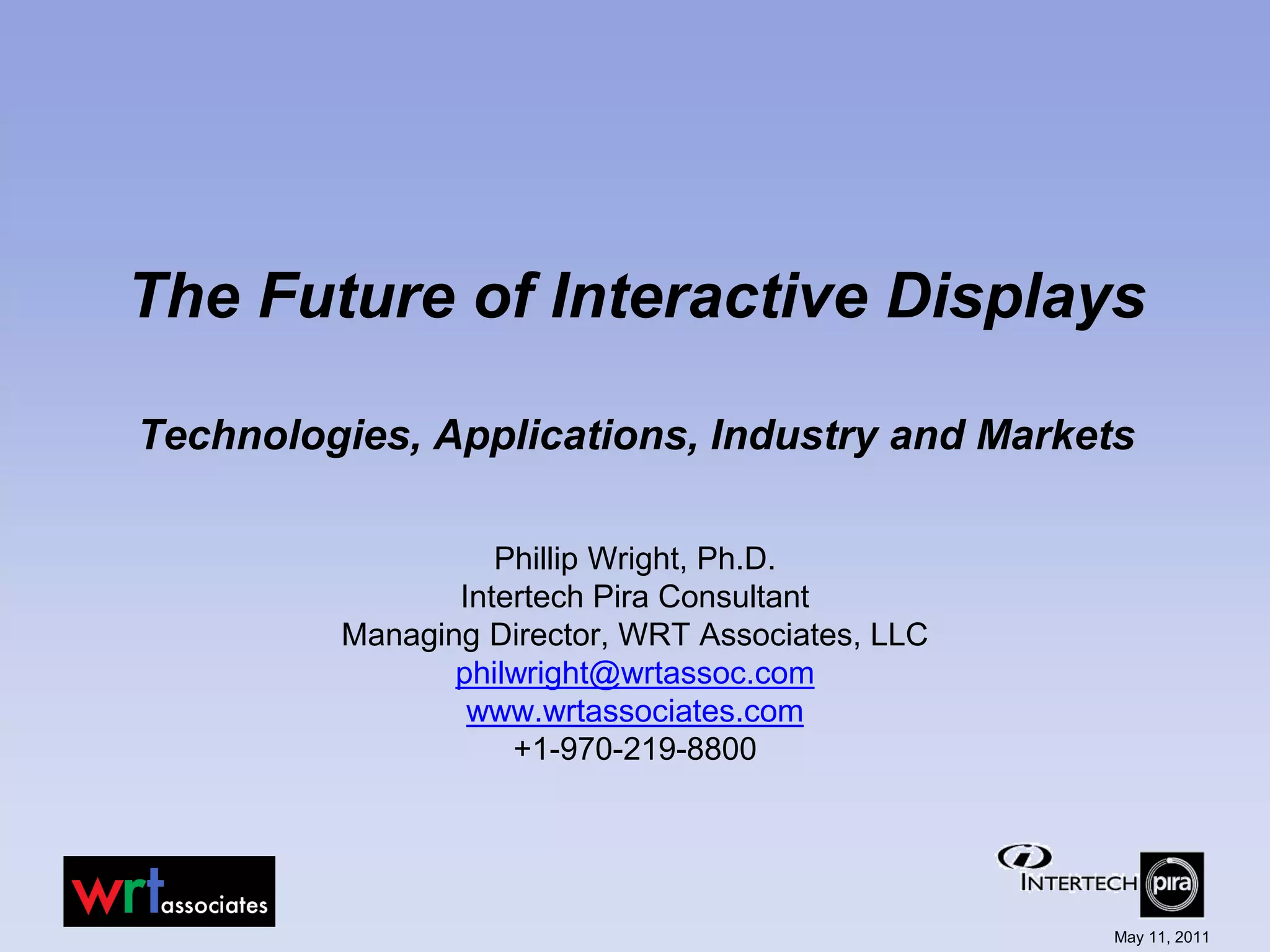 Dr. Phillip Wright, an expert in interactive display technologies, outlines the evolution and market outlook for these systems, emphasizing their increasing complexity and application diversity. The future of interactive displays is projected to significantly impact various sectors, including education, telemedicine, entertainment, and advertising, with an estimated total available market exceeding $600 billion. The presentation highlights key industry trends and opportunities for growth, supported by a report titled 'The Future of Interactive Displays to 2016.'