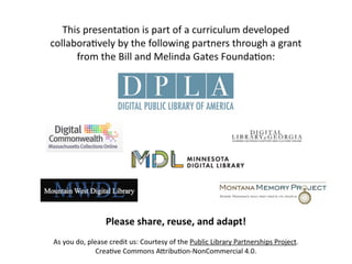This webinar provided an introduction to digitization for libraries and discussed planning digitization projects. It summarized the Digital Public Library of America's curriculum for training libraries in digitization skills. Presenters from DPLA and Montana Memory Project discussed selecting content, copyright, metadata, and promoting digitized collections. A participant from East Central Regional Library shared their experience applying skills from the training to digitize historical photographs. The webinar encouraged libraries to explore the free online curriculum and discuss any questions.