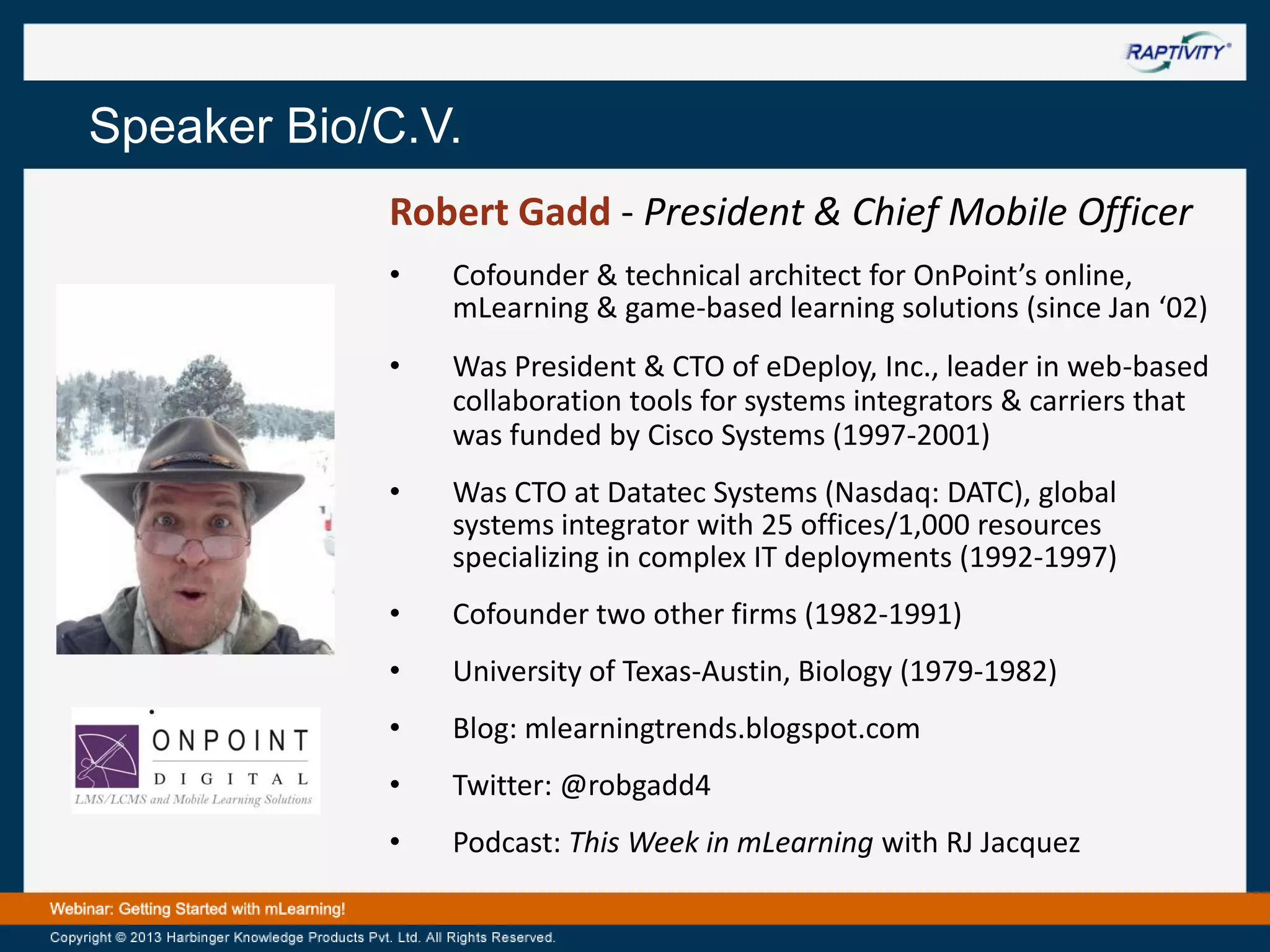This speaker bio summarizes Robert Gadd's professional experience and areas of expertise. He is the President and Chief Mobile Officer of OnPoint Digital, where he cofounded their online, mobile, and game-based learning solutions in 2002. Previously, he was President and CTO of eDeploy and CTO of Datatec Systems. He has over 30 years of experience in the technology field and focuses on mobile learning trends through his blog and podcast.