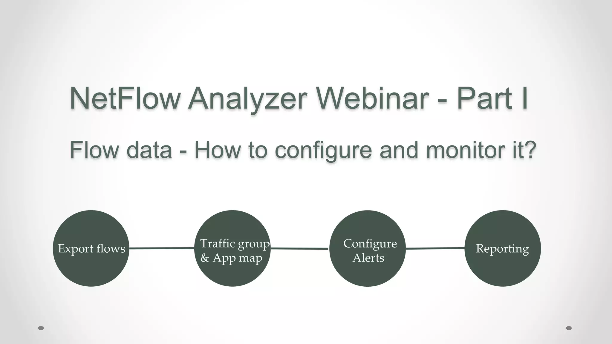 The document outlines a webinar discussing the configuration and monitoring of netflow data using the Netflow Analyzer tool. It covers essential topics such as traffic group mapping, alert configuration, reporting challenges, and prerequisites for setting up the tool. Additionally, it provides technical details on flow configuration and introduces the licensing structure based on interface counts.