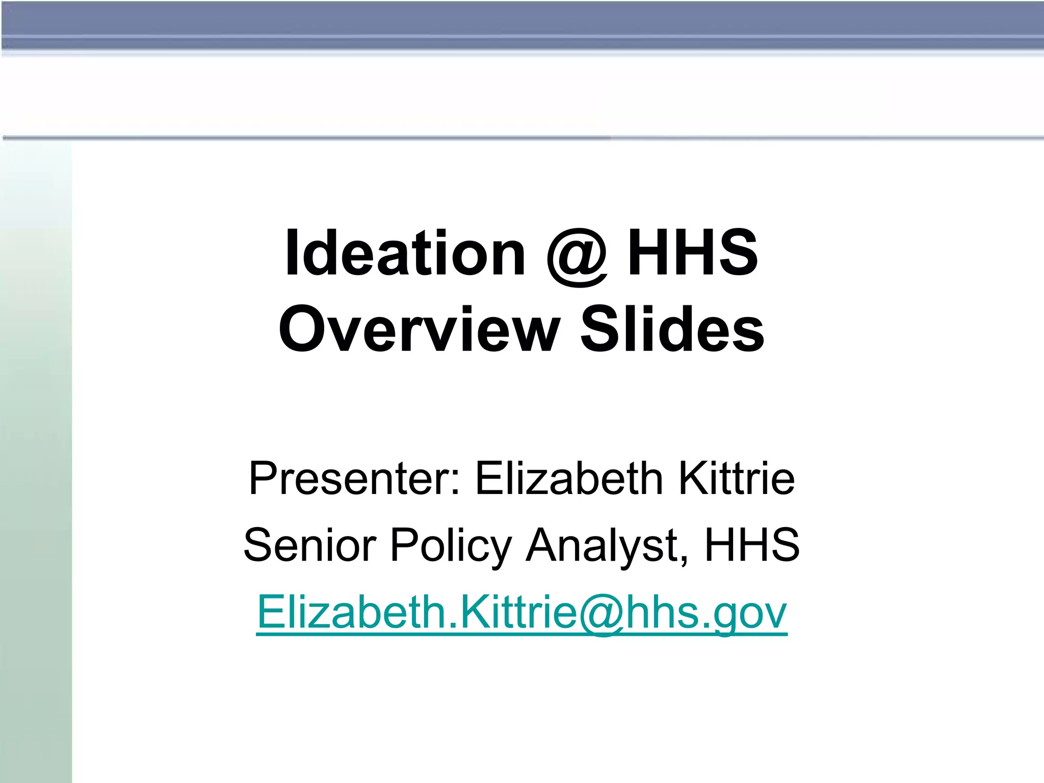 This document provides an overview of ideation tools and their uses at HHS. It discusses what ideation is, why it is important for federal agencies, how ideation tools can help agencies, and what resources are available. Ideation involves generating new ideas or solutions using crowd-sourcing technologies. It allows agencies to post questions, submit and discuss ideas, and vote on ideas. Agencies are using ideation to engage employees and stakeholders in problem-solving. Examples of agencies using ideation tools internally and externally are provided.