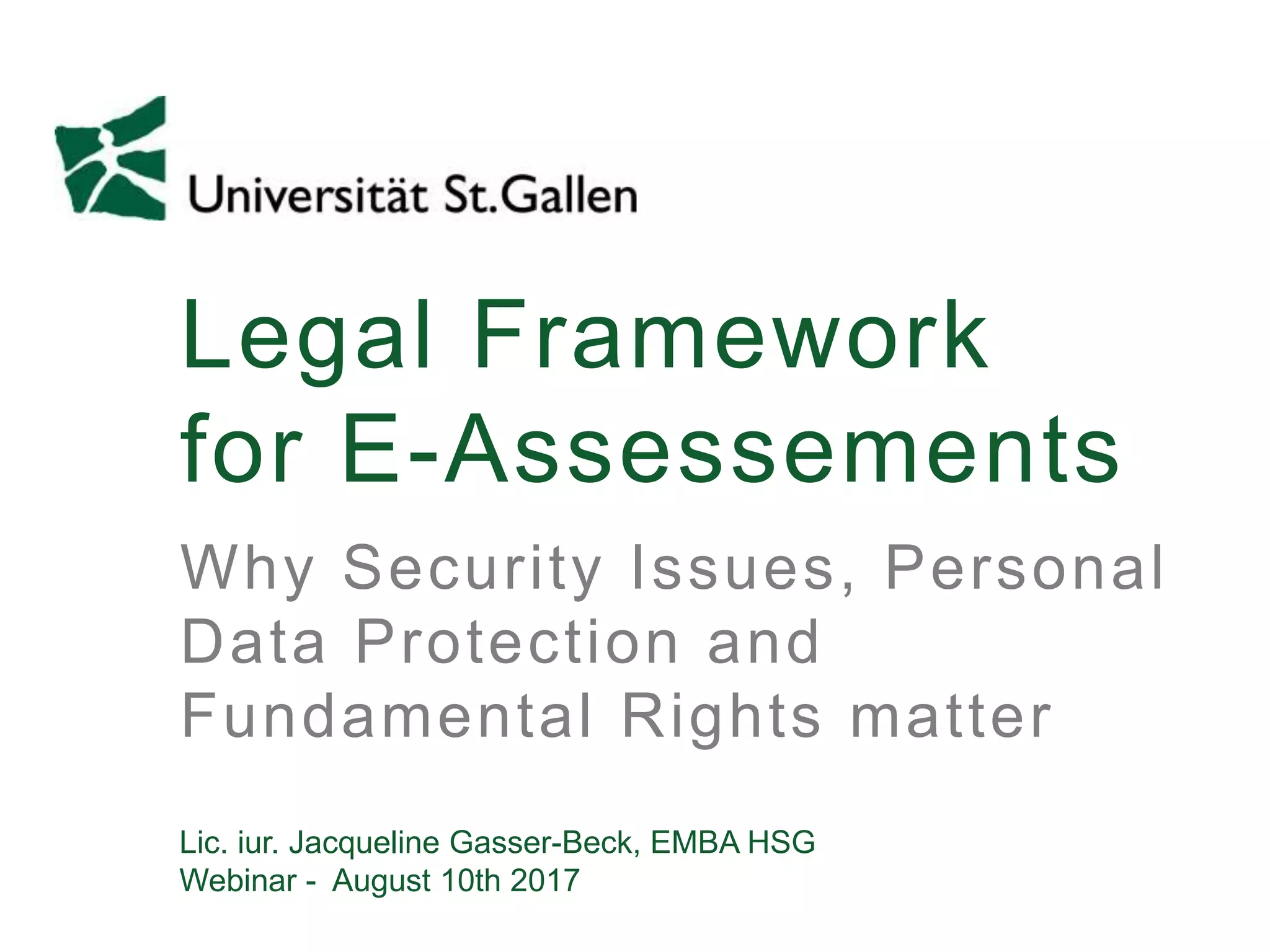 The document discusses the legal framework for e-assessments, emphasizing the importance of security, personal data protection, and fundamental rights in online examinations. It highlights the need for fairness and reliability in e-exams, referencing both past lawsuits and specific legal protections related to personal data under Swiss law. Furthermore, it outlines best practices and checklists for implementing effective and secure e-assessment environments in higher education institutions.
