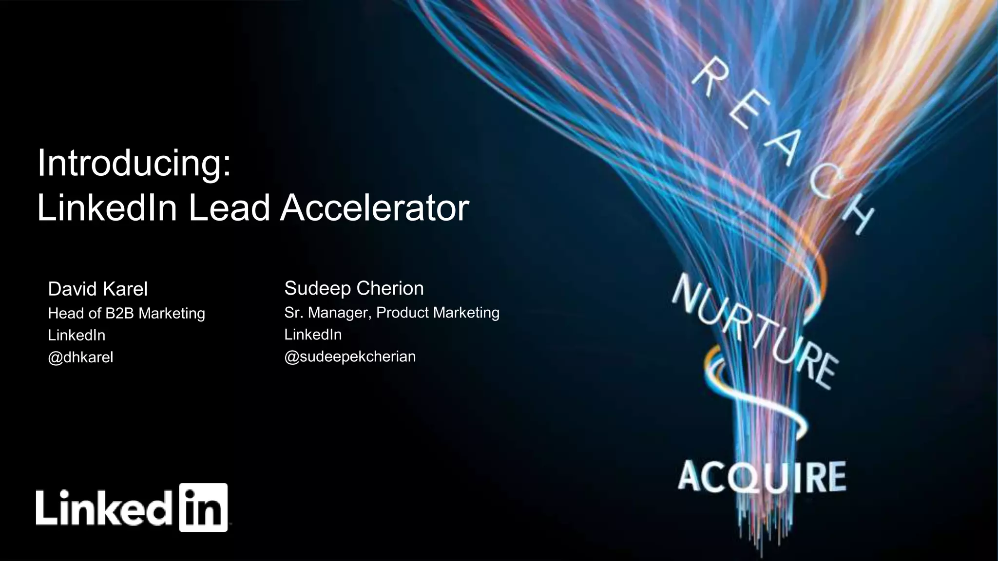 This document introduces LinkedIn Lead Accelerator, a marketing automation tool that helps engage prospects across different platforms using targeted ads and relevant content. It identifies the right audiences to reach based on professional profiles and behaviors. The tool then nurtures leads across LinkedIn, Facebook, and display networks, and helps convert visitors into leads using form autofill. It also provides reporting and optimization to measure success. Customer testimonials highlight how it increased leads, sales, and re-engaged contacts beyond email.
