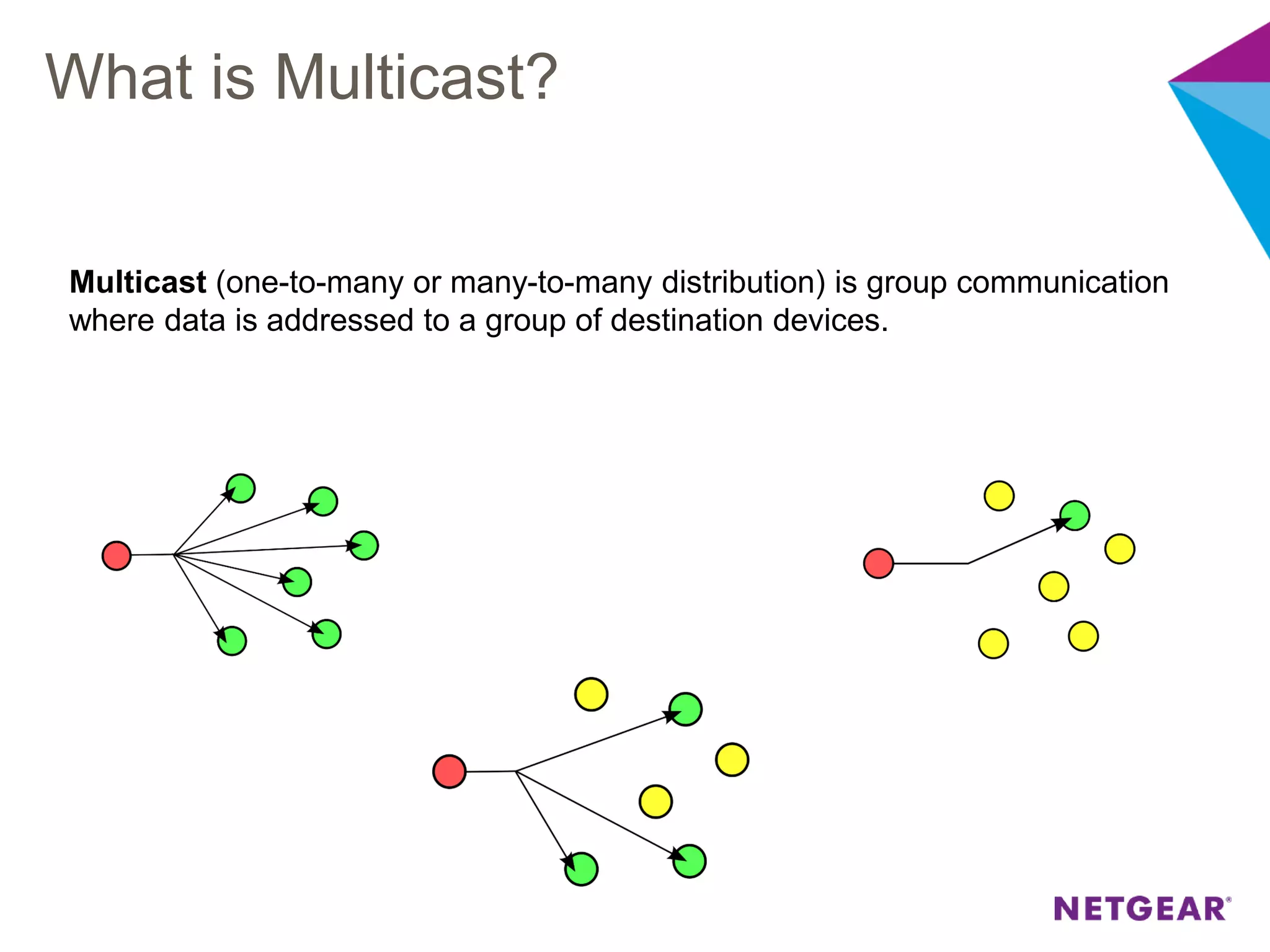 The document explains multicast communication, which enables the distribution of data to a group of devices rather than individual ones. It discusses the importance of IGMP snooping for efficient traffic management in networks that utilize video services like IPTV, facilitating the creation of multicast groups without needing an external device when built into a switch. Additionally, it covers multicast VLAN registration (MVR) to enable multicast traffic between different VLANs and outlines configuration steps using the VLC media player.