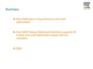 The document discusses Reaxys Medicinal Chemistry and how it supports hit-to-lead and lead optimization processes. It provides high quality data on topics like efficacy, ADMET properties, and animal models to help computational and medicinal chemists. The pX concept normalizes bioactivity measurements like IC50, Ki, and % inhibition into a single comparable metric, making it possible to compare compound affinity regardless of the metric reported. This allows researchers to more easily search for and analyze active compounds.