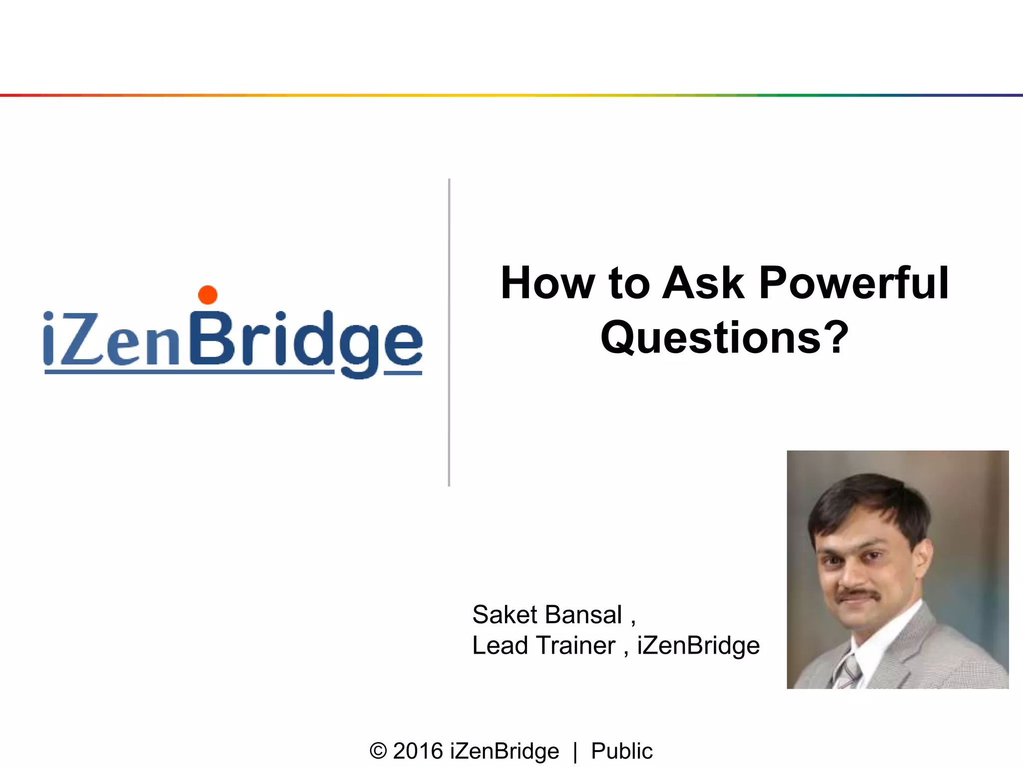 The document discusses the importance of asking powerful questions in various coaching scenarios, especially during sprint reviews in Agile environments. It outlines different types of questions: investigation, advice, detail gathering, thinking, and planning, each aimed at facilitating problem-solving and self-awareness. Additionally, it introduces the ICP-ACC certification program that focuses on Agile coaching and its upcoming sessions.