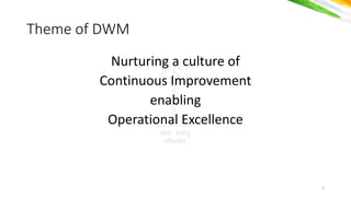 The document outlines a webinar on Daily Work Management (DWM) presented by M. Hariharan, focusing on nurturing a culture of continuous improvement for operational excellence. It discusses the building blocks of DWM, alignment with key performance indicators (KPIs), and various initiatives to enhance daily work processes. Key elements include the three eyes of Buddha conceptual framework by Prof. Shoji Shiba and the importance of suggestion schemes in driving improvements.