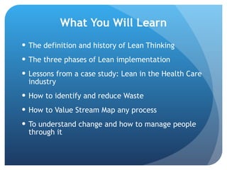 This document discusses Lean operations and how its principles can be applied in non-manufacturing environments. It defines Lean thinking, outlines its history and key concepts, and provides a case study of how Virginia Mason Medical Center successfully implemented Lean in a healthcare setting. The document explains how Lean was used to stabilize processes, standardize workflows, simplify tasks, eliminate waste, and continuously improve operations, resulting in significant benefits like reduced costs, errors and waste.