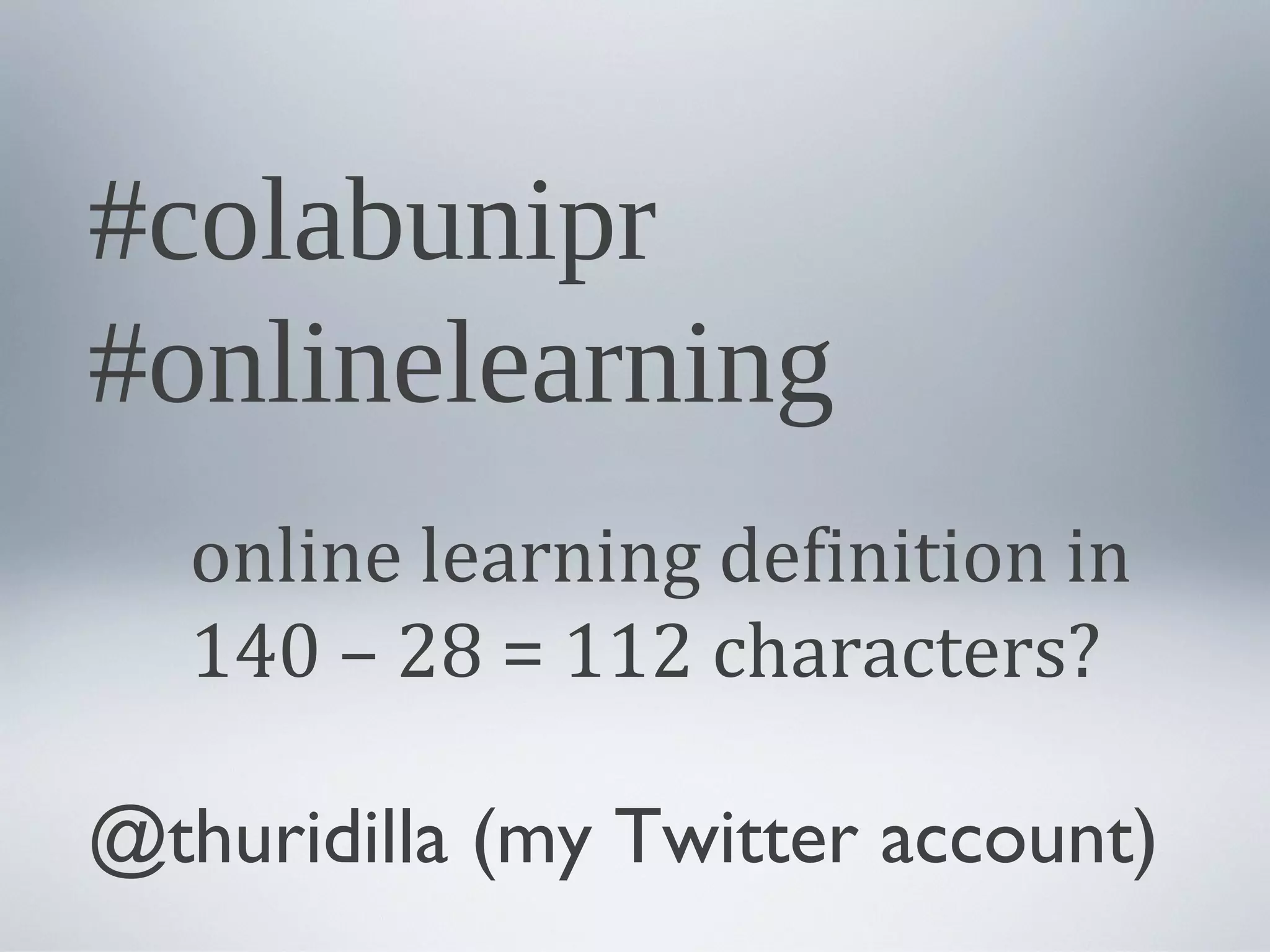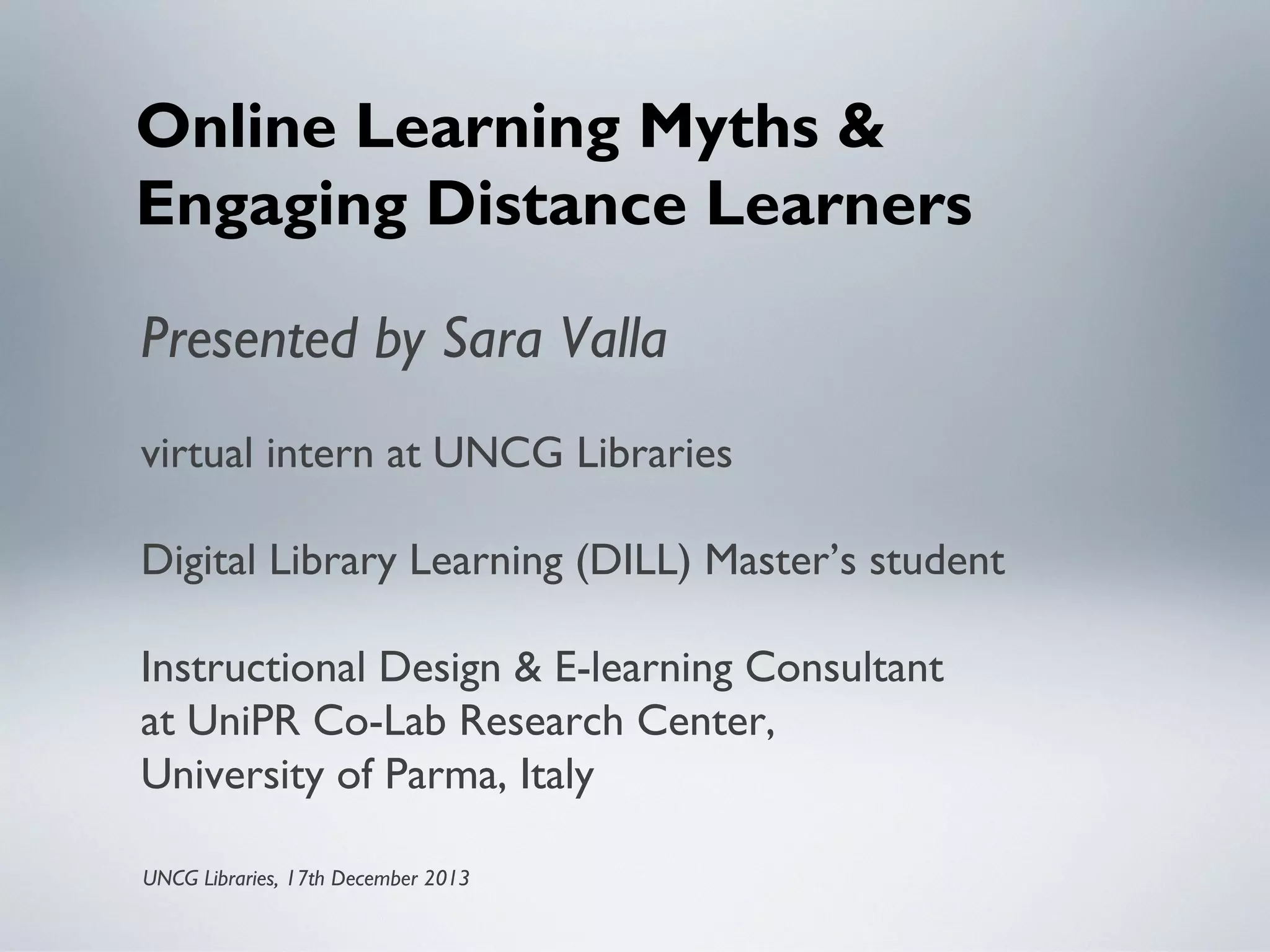 The document presents an overview of online learning, highlighting its definition, instructional design strategies, and methods to engage distance learners. It emphasizes the importance of creating meaningful, memorable, and motivational learning experiences and addresses common myths surrounding online education. The context of UNIPR Co-Lab as a collaborative research center is also discussed, alongside various technologies and approaches to enhance online learning experiences.