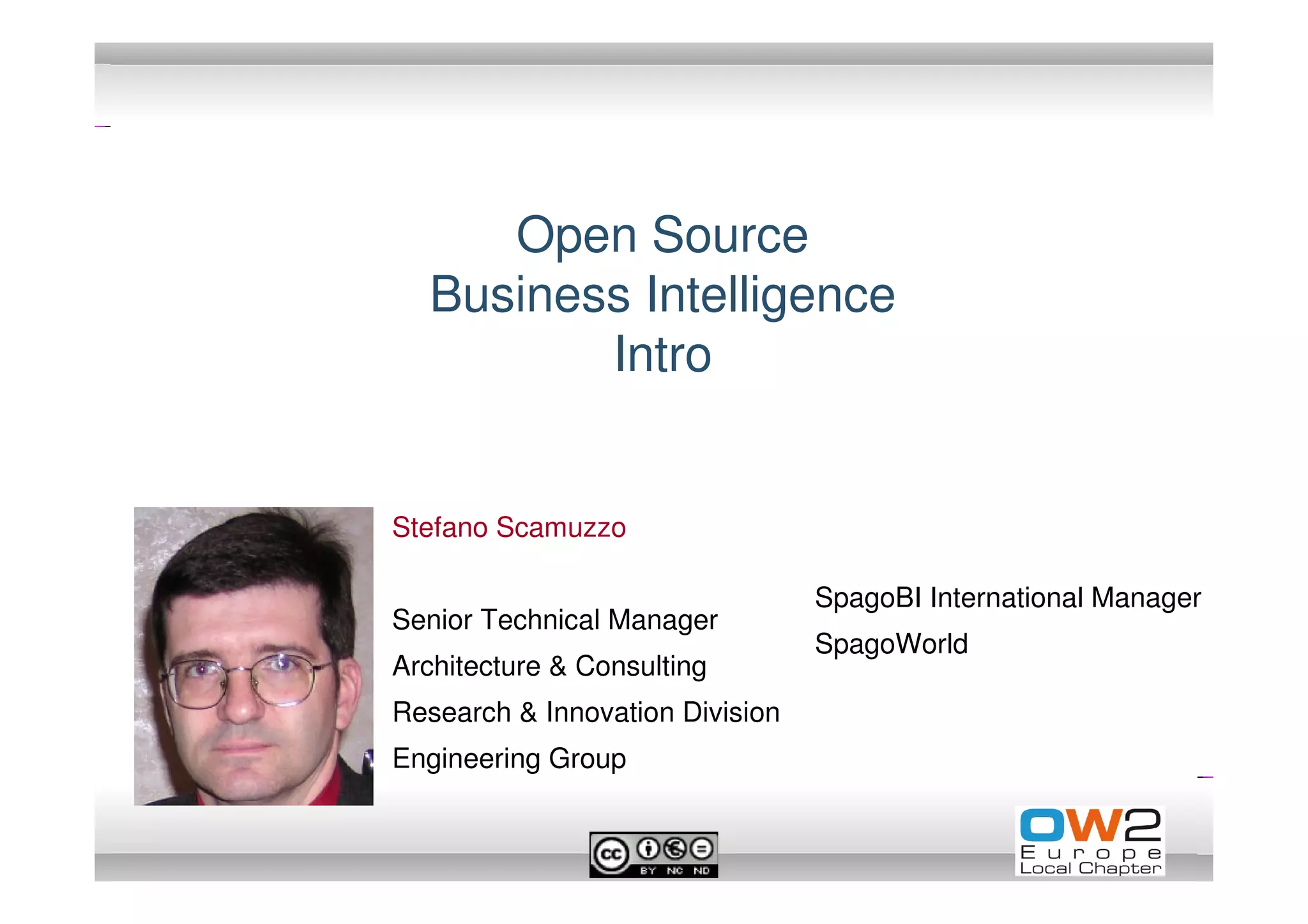 The document discusses the transition from traditional closed-source business intelligence solutions to open-source business intelligence (OSBI) alternatives, emphasizing the cost reduction, flexibility, and innovation offered by OSBI. It highlights the current landscape of data warehousing and various open-source tools for reporting, OLAP, and analytics, including platforms like Pentaho and SpagoBI. The content also mentions key players in the open-source data warehousing space, technology trends, and future directions such as cloud business intelligence and predictive analysis.