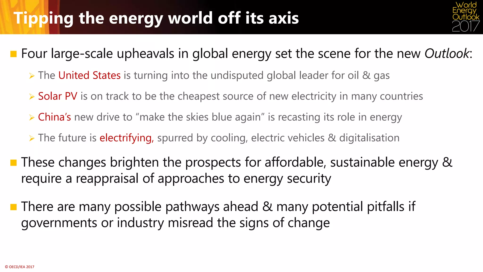The OECD/IEA report highlights significant upheavals in the global energy landscape, including the U.S. becoming the leading oil and gas producer, the rise of solar PV as a major electricity source, and China's commitment to improving air quality. Electric vehicles are transforming passenger car energy use and mitigating oil demand growth, though sectors like aviation and shipping continue to increase consumption. As global gas trade shifts towards a more flexible market, particularly with LNG, sustainable energy opportunities arise but face challenges such as financing new projects and competing energy sources.