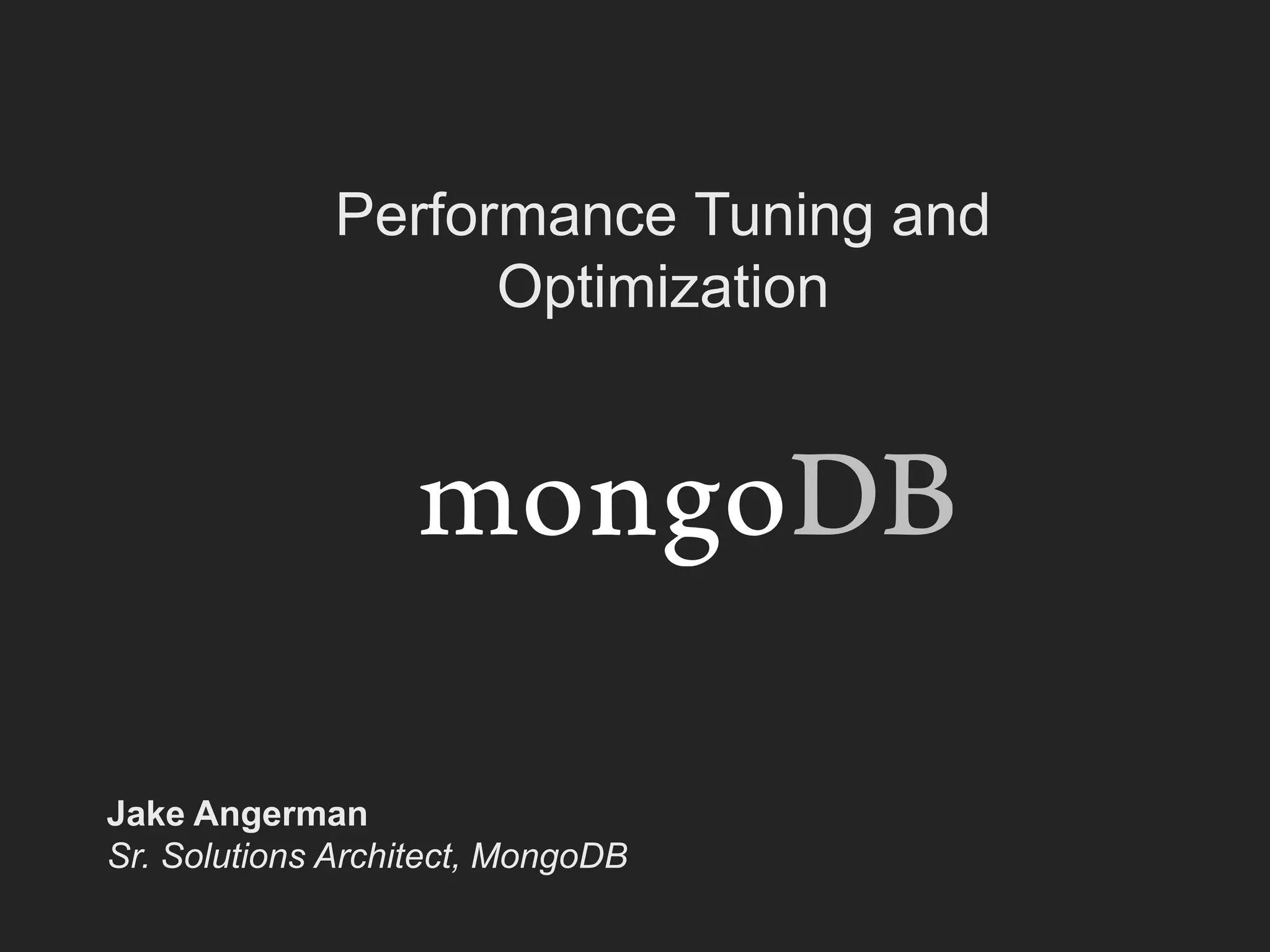 The presentation by Jake Angerman focuses on performance tuning and optimization within MongoDB, distinguishing between optimizing for efficiency and tuning for load handling. It emphasizes the importance of understanding the implications of premature optimization and introduces measurement tools such as log files and profilers for identifying bottlenecks. Additionally, it discusses schema design, access patterns, and indexing strategies that can significantly impact database performance.