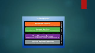 This document provides an overview of cloud computing and its application in education, particularly distance education. It discusses key cloud concepts like deployment models (IaaS, PaaS, SaaS), benefits of cloud computing for education including cost reduction and improved collaboration, and how cloud computing can enhance distance learning by providing flexible, on-demand access to educational resources for students and teachers. The document argues that cloud computing has the potential to transform how educational institutions utilize and consume IT resources to better support teaching and learning.