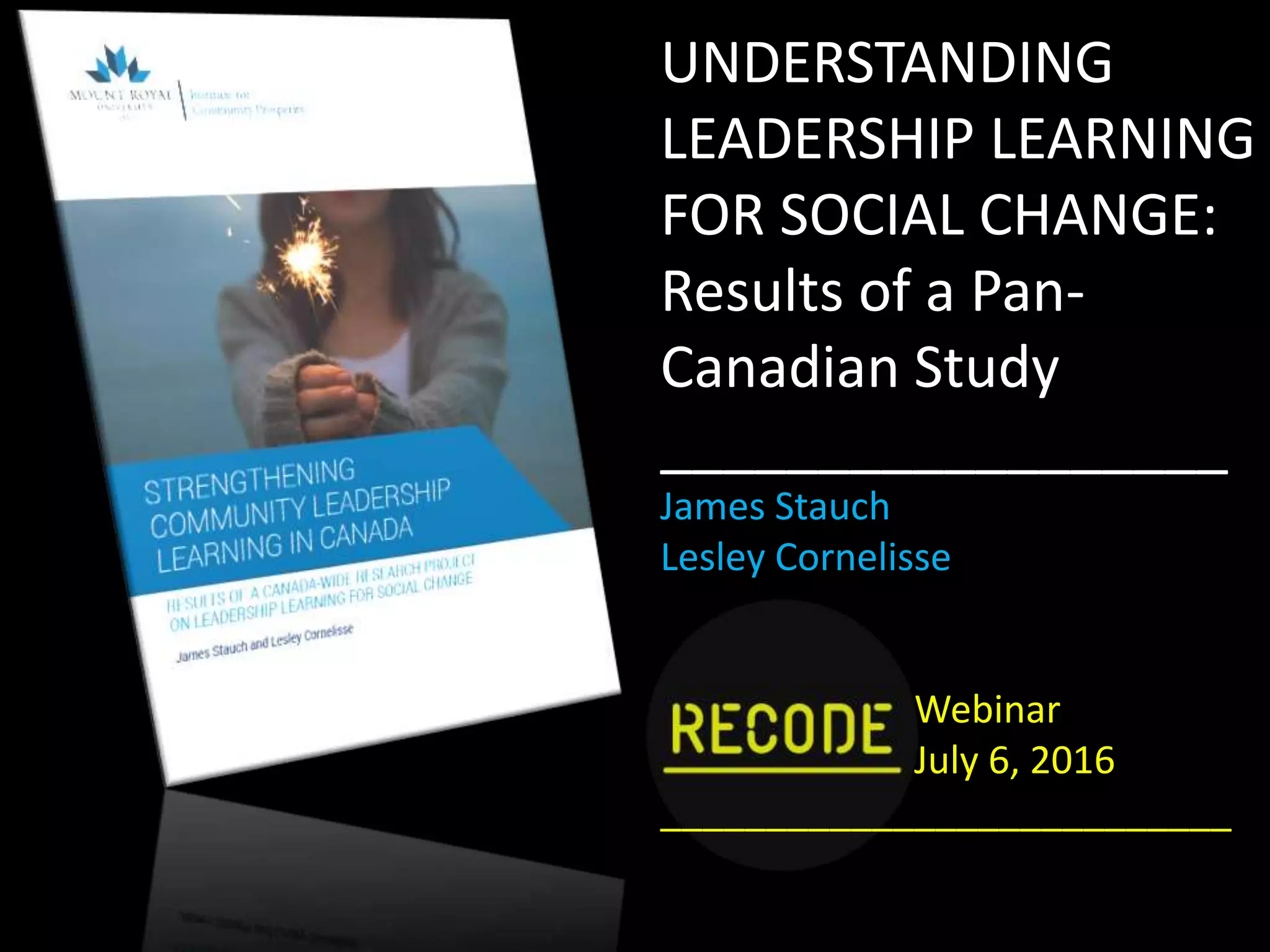 The document presents findings from a pan-Canadian study on leadership learning aimed at fostering social change, highlighting the importance of training individuals to become effective leaders in various community-oriented sectors. It emphasizes the need for leadership programs to connect participants to their communities and contexts while addressing challenges like recruitment and evaluation. The study calls for further exploration of leadership identity and engagement strategies to better equip participants for social transformation.