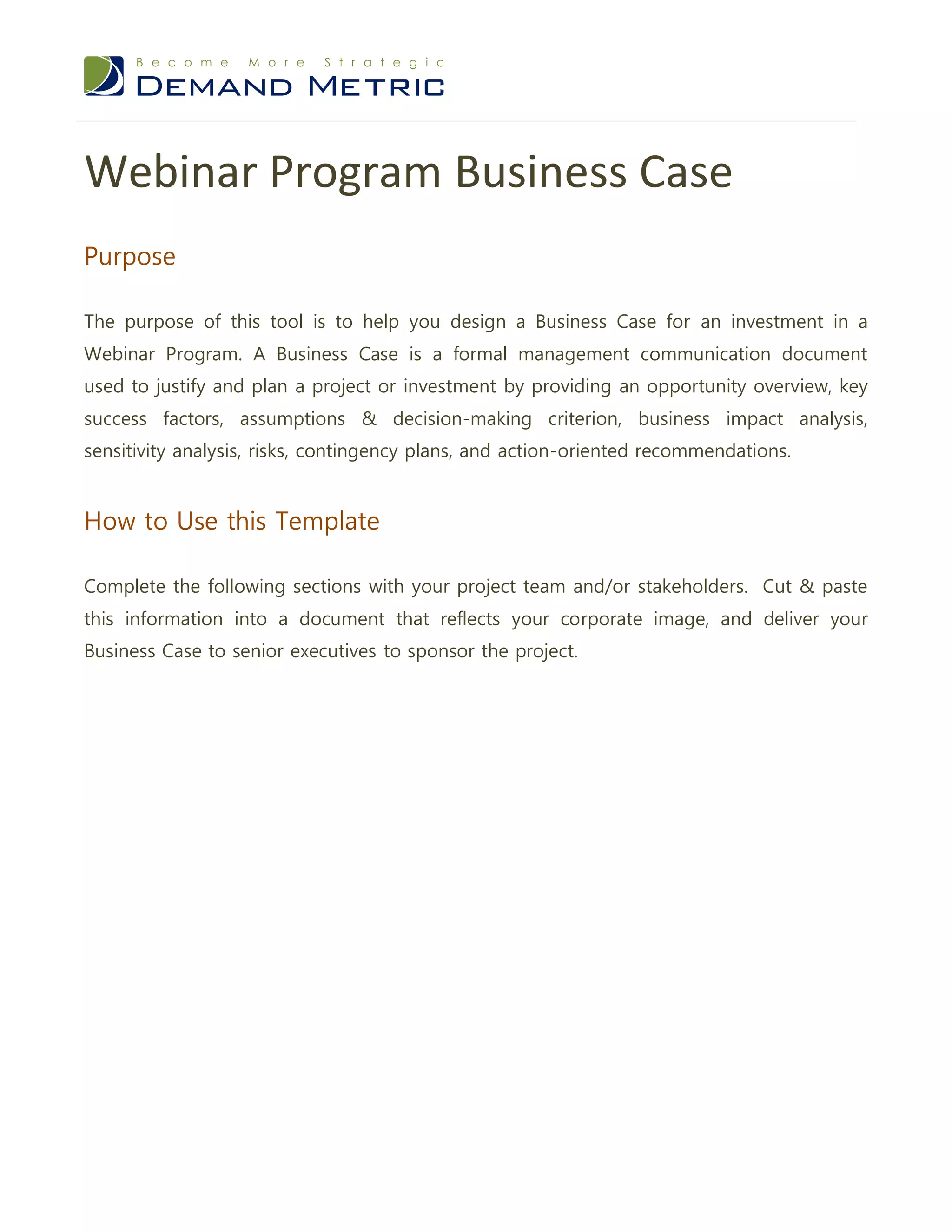 The document outlines a comprehensive business case template for investing in a webinar program, detailing sections like opportunity overview, business impact analysis, risk assessments, and an action plan. It aims to help teams justify and plan the project by providing essential elements such as project scope, key success factors, and decision-making criteria. Additionally, it emphasizes engaging stakeholders and securing executive sponsorship to ensure the program aligns with organizational goals.