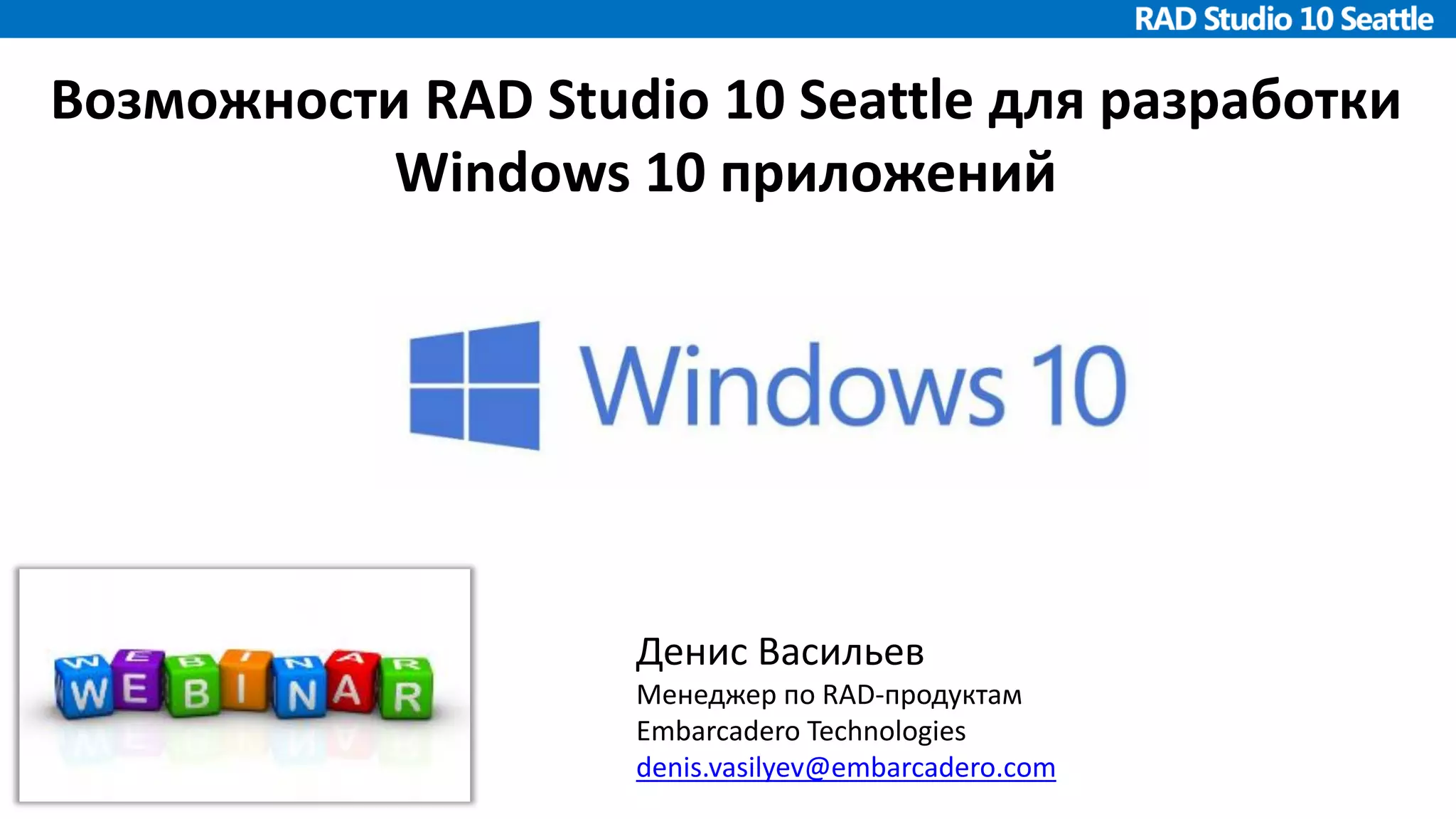 Документ описывает возможности RAD Studio 10 Seattle для разработки приложений под Windows 10, включая поддержку универсальной платформы Windows (UWP) и новые визуальные компоненты для VCL. Отмечается интеграция с WinRT, улучшения в FireMonkey для Windows и поддержка высоких разрешений и многомониторных систем. Также упоминается о вебинарах и ресурсах для обучения разработке с использованием RAD Studio.