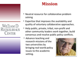 The document outlines a training program focused on managing and resolving conflict, led by Amanda Murphy from the Ruckelshaus Center. It emphasizes understanding conflict styles and de-escalation techniques, offering tools and methods for effective communication and problem-solving in various organizational contexts. Additionally, it provides insights into the nature of conflict, approaches for resolution, and the importance of emotional control in conflict situations.