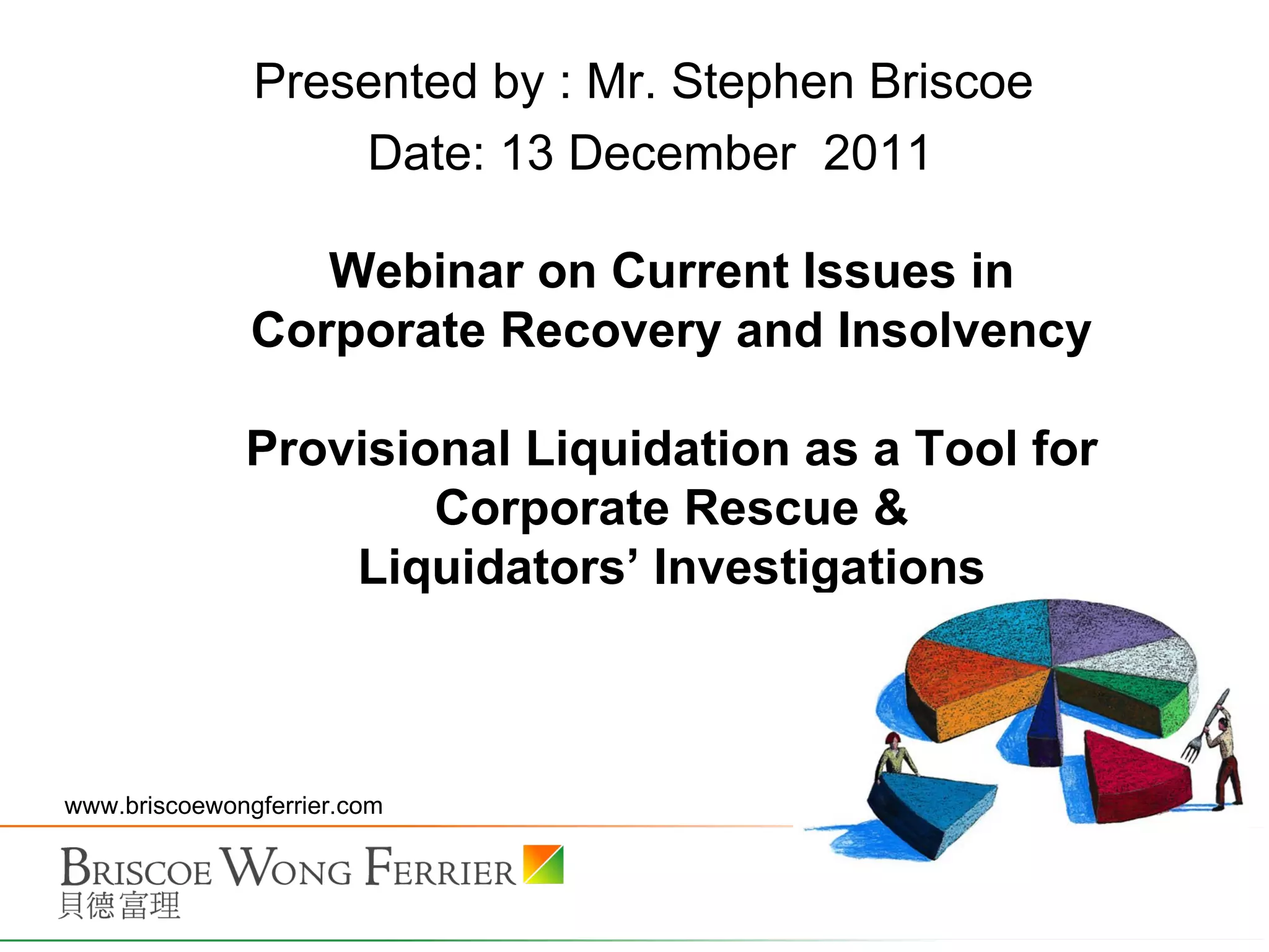 The document summarizes the use of provisional liquidation as a tool for corporate rescue in Hong Kong. It discusses how provisional liquidators can safeguard a company's assets, continue operations, and potentially restructure the company through a scheme of arrangement. It also provides an example of how provisional liquidators marketed and sold a distressed company as a going concern, resulting in full payment to preferential creditors and a substantial distribution to unsecured creditors.