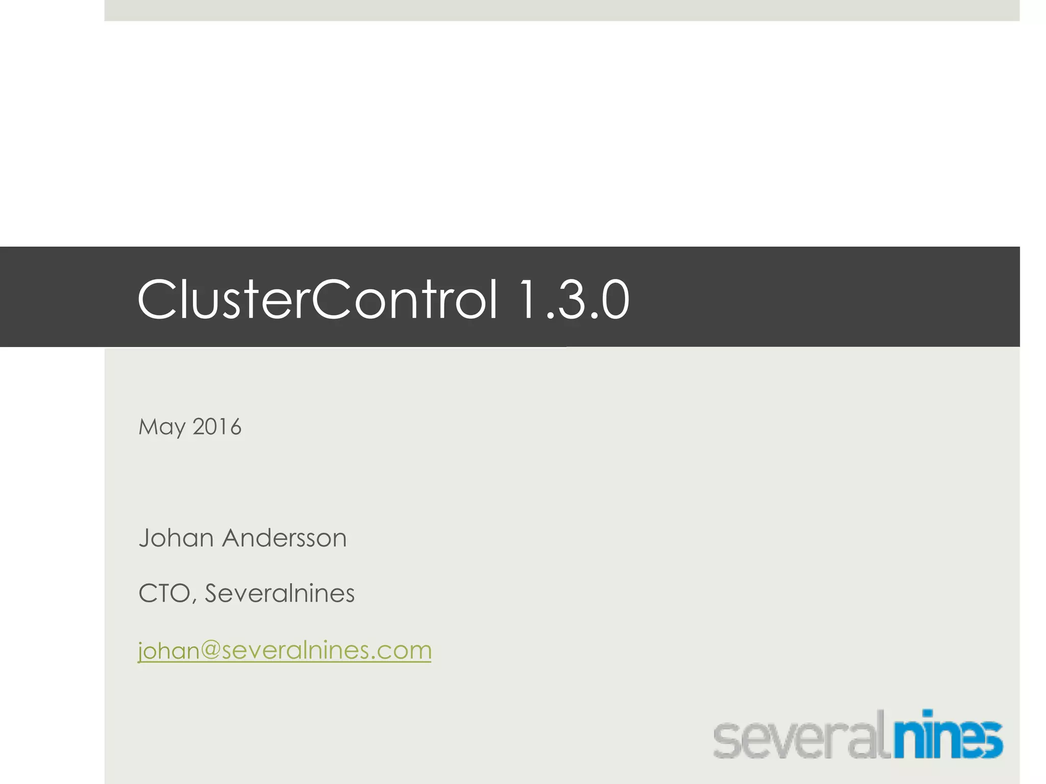 ClusterControl 1.3.0 offers enhanced key management, security improvements, and operational reporting for managing MySQL/Postgres clusters. Key features include SSL certificate management, automated server configurations, creation of NDB clusters, and detailed backup and availability reports. This version emphasizes secure access through token-based authentication for controlling data access.