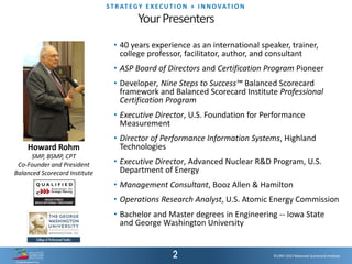 The document discusses the integration of strategy execution and innovation in organizations, highlighting their interrelationship and importance for high performance. It presents various frameworks for measuring and managing innovation, emphasizing leadership commitment and a culture that encourages creativity. The text also outlines different forms of innovation, strategic objectives, and effective performance measurement techniques to drive organizational success.