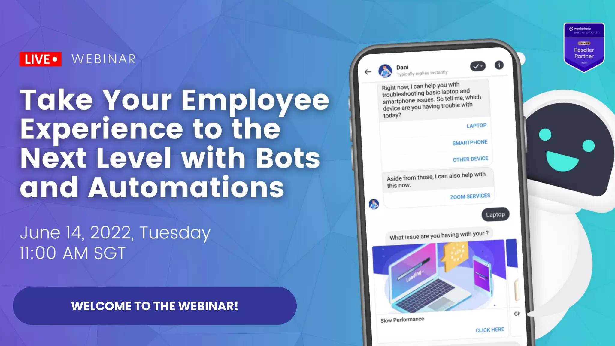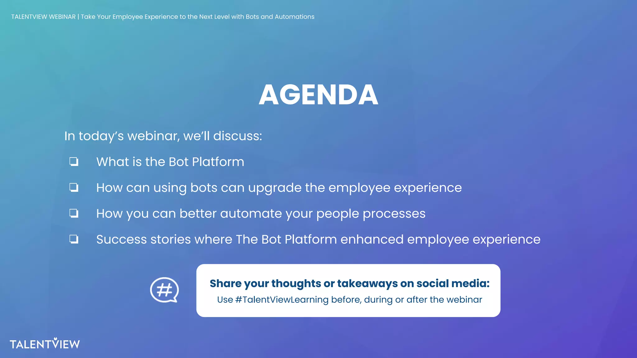 The webinar focuses on how bots and automation can enhance employee experience by streamlining people processes and improving engagement. It covers the capabilities of a bot platform, real-world success stories, and implementation tips for organizations. Key advice includes empowering business units to take ownership and starting small with bot initiatives.
