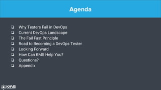 The document discusses the challenges testers face in adopting DevOps, emphasizing the transition from traditional testing to a more integrated approach within development operations. It presents the 'fail fast' principle as a method to enhance testing effectiveness, advocating for rapid feedback and ownership of automated acceptance tests by testers. The document outlines necessary skills, tools, and processes for becoming a successful DevOps tester and highlights the increasing adoption of DevOps in enterprise companies.