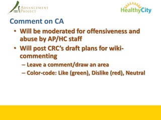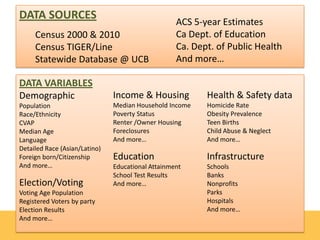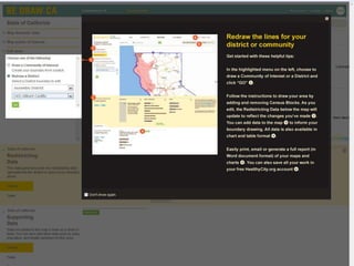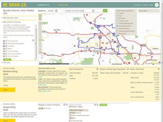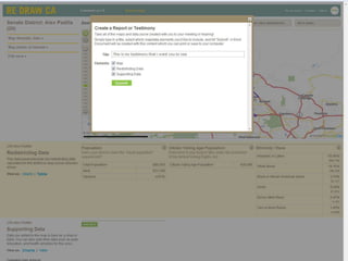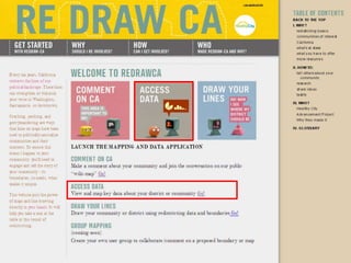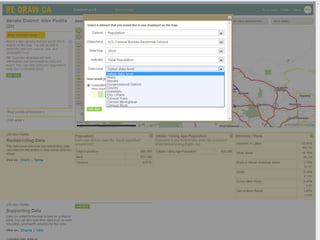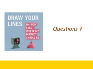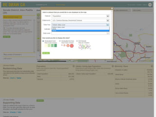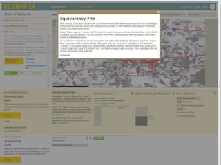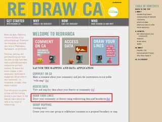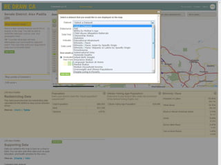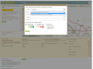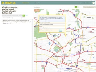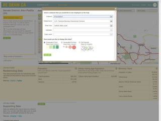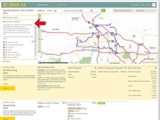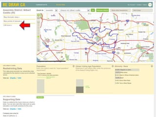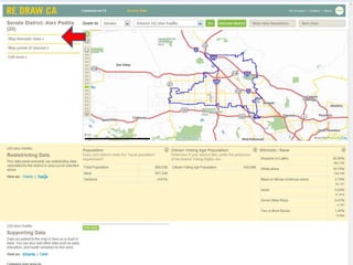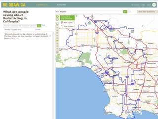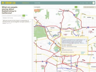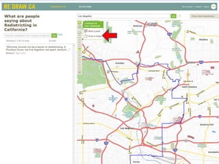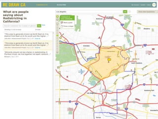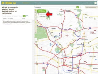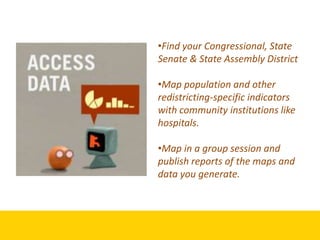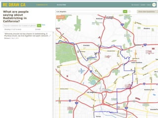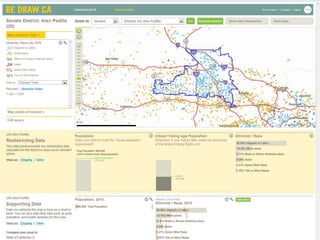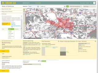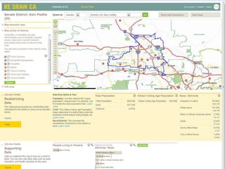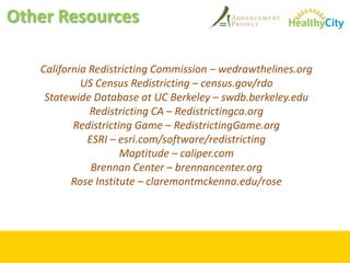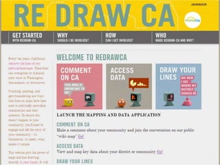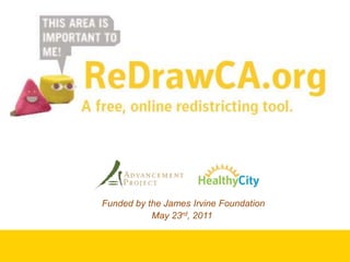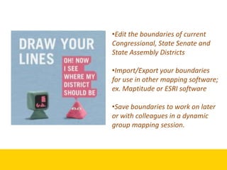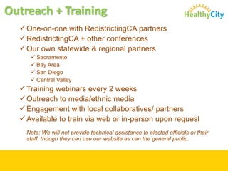 This document provides information about a multi-racial public policy organization that works on social equity issues. It has offices in Los Angeles, Sacramento, and Washington D.C. and focuses on issues like health, redistricting, and census work. The document describes tools and resources the organization provides like an online mapping platform called ReDrawCA for redistricting engagement and a community research lab. It also lists partners and outlines services like training, data sources, and other redistricting resources available.