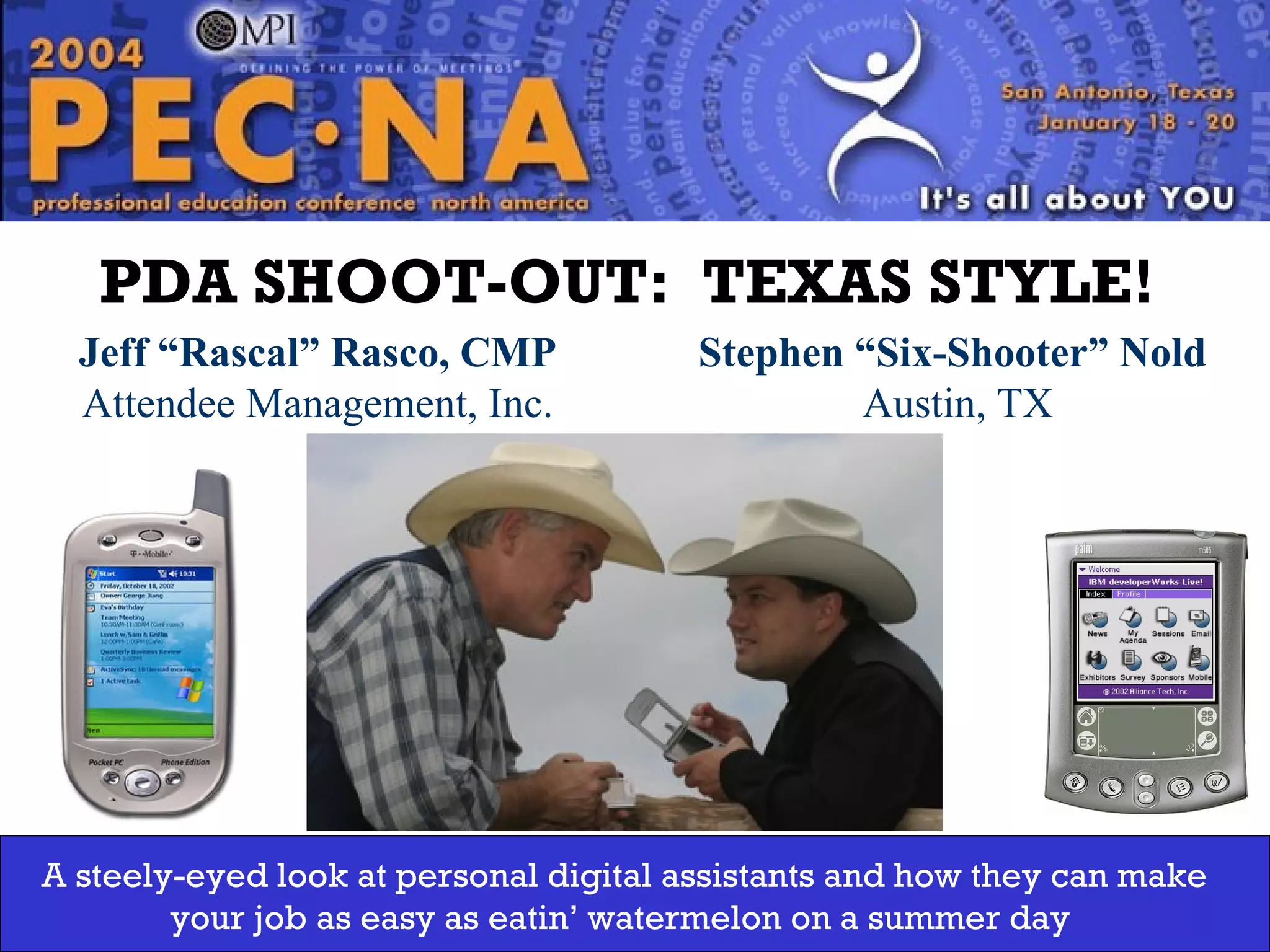 This document discusses personal digital assistants (PDAs), comparing Palm OS, Pocket PC, and BlackBerry devices. It provides information on key factors to consider like operating system, memory, screen size, and applications. Palm OS is recommended for basic tasks due to lower prices and ease of use, while Pocket PC offers more power and multimedia. BlackBerry is best for constant connectivity and push email. The document also lists PDA manufacturers, operating systems, and resources for learning more.