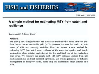 3) European fish stocks are also in poor shape, with over 50% considered overexploited or collapsed. However, adopting generic harvest control rules based on maintaining biomass levels could increase catches by 63% while rebuilding stocks.