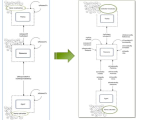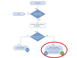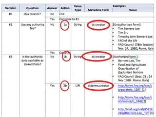 The document outlines strategies for selecting appropriate encoding methods to convert bibliographic data into a linked data format. It emphasizes the importance of adhering to metadata standards, identifying minimum properties for effective data sharing, and offers a structured approach through decision trees for implementing the LOD-enabled bibliographic data model. Key recommendations include promoting established metadata standards and utilizing controlled vocabularies and resource URIs for better data interoperability.