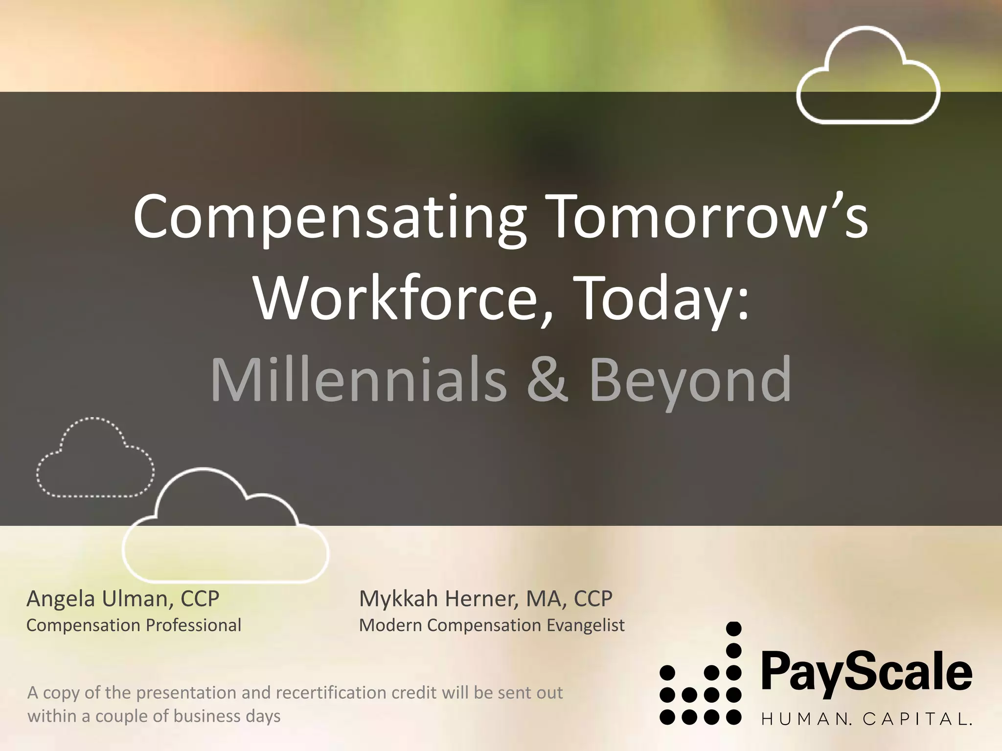 The document summarizes a presentation about tailoring compensation to attract and retain different generations in the workforce. It discusses defining generations based on characteristics like communication preferences, career mindsets, and average job tenures. It also provides tips on using a mix of pay including bonuses, flexible benefits, and advancement opportunities. The presentation emphasizes the importance of communication transparency regarding compensation and addressing any skills gaps.