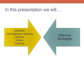The document outlines effective strategies for teaching English language learners (ELLs), emphasizing the importance of discourse, cultural responsiveness, and differentiated instruction. It suggests methods for supporting oral language, reading, and writing through scaffolding, text selection, and various adaptations to meet diverse student needs. Additionally, it provides resources for further exploration of these strategies.
