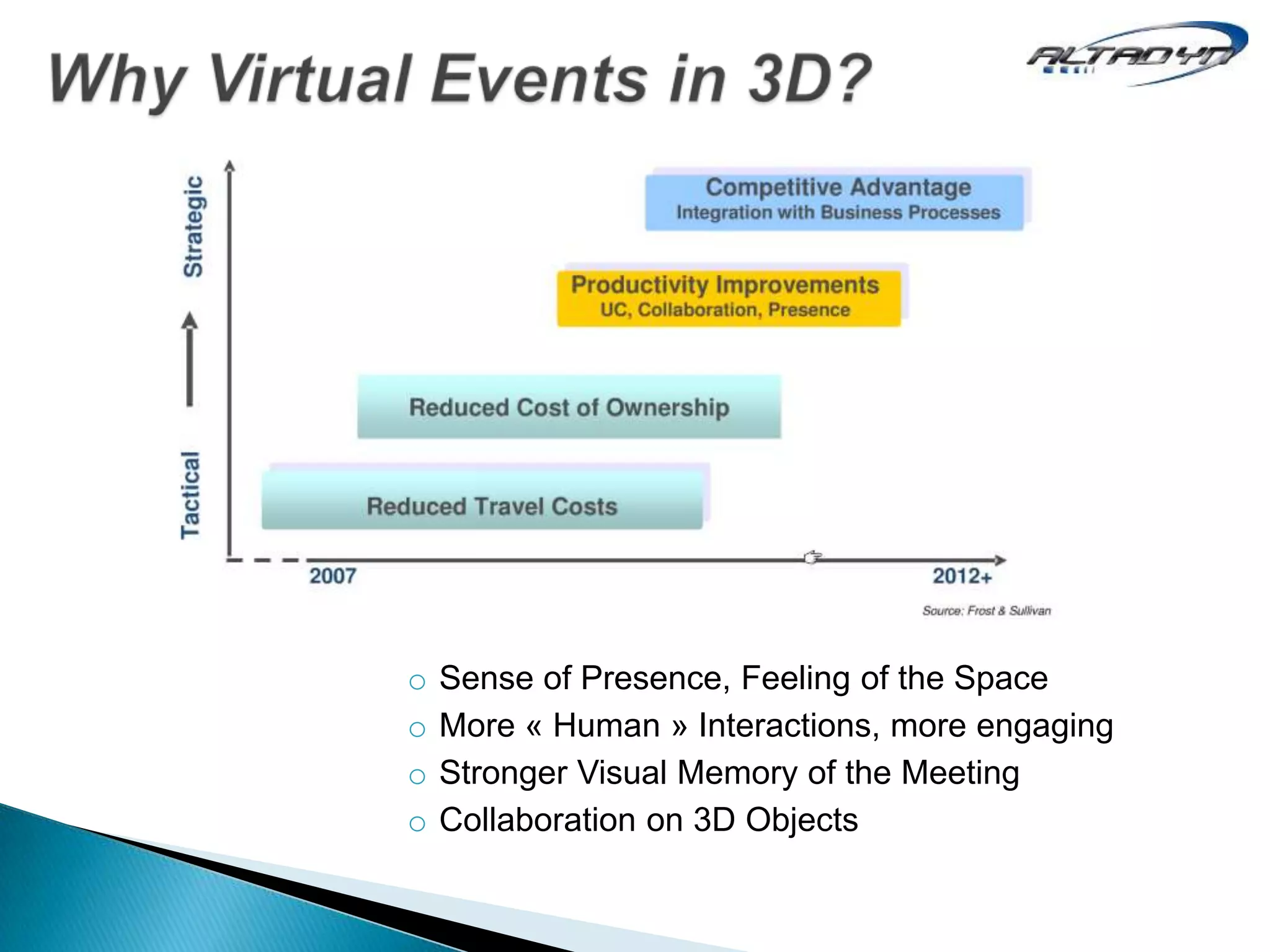 This document discusses improving virtual meetings through increased sense of presence, more engaging human interactions, and stronger visual memory of meetings through collaboration on 3D objects.