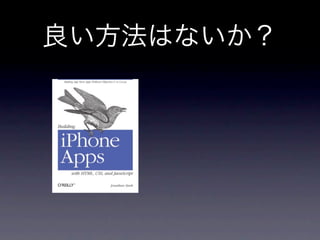 The document discusses iPhone development and provides code examples in Objective C and Ruby. It lists the author's Twitter ID and focuses on technologies for building hybrid apps that combine web apps and native iPhone functionality like access to GPS and vibration. Key frameworks mentioned are jQuery Mobile for building web apps and PhoneGap for packaging them into native iPhone apps distributed through the App Store.