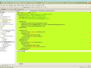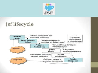 Java Server Faces (JSF) is a web application framework that uses XHTML markup and allows building user interfaces for Java-based web applications. The document discusses the JSF architecture which follows the Model-View-Controller pattern and includes XHTML files, CSS/JavaScript resources, servlet configuration files, class files, and library files. It then provides an example of creating a simple JSF project to convert meters to inches that displays the result on screen after configuring JBoss and starting the application.