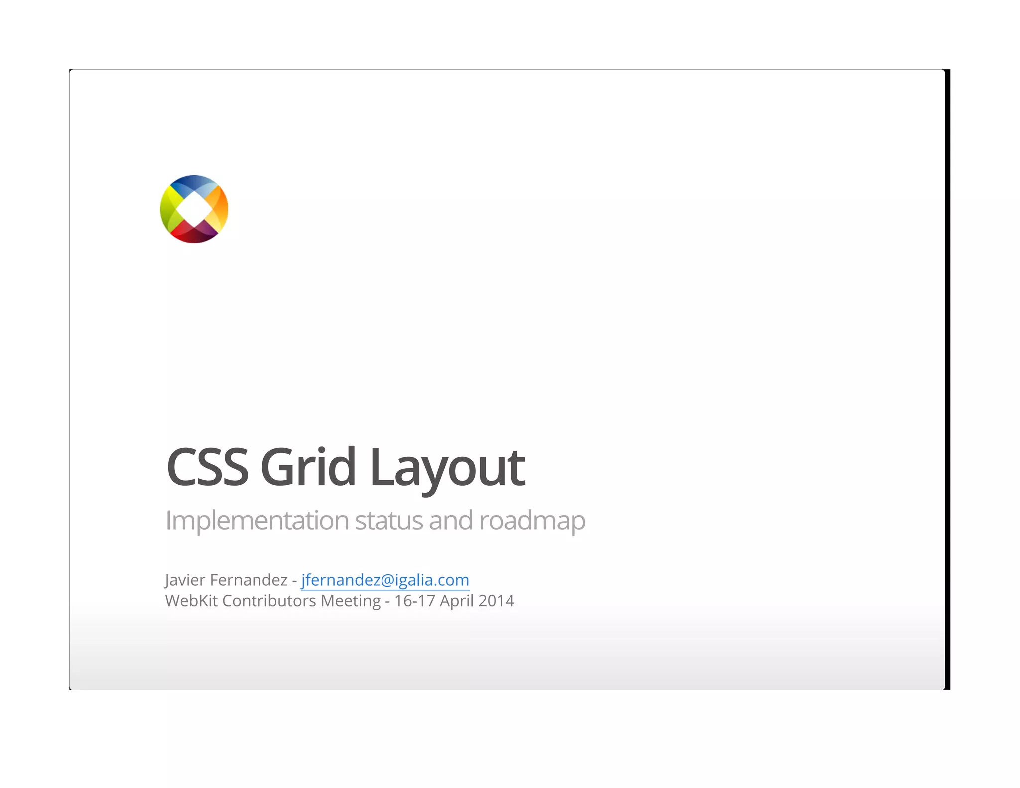 The document discusses CSS Grid Layout, which provides a mechanism for dividing space into rows and columns to define a grid-based layout. It allows precise placement of elements, reflowing optimally for different devices. The document covers grid concepts like lines, tracks, cells and areas. It also describes the syntax for defining track breadths and placing items in the grid. Implementation status is provided, with grid layout already shipped in IE and work ongoing in Blink and WebKit.