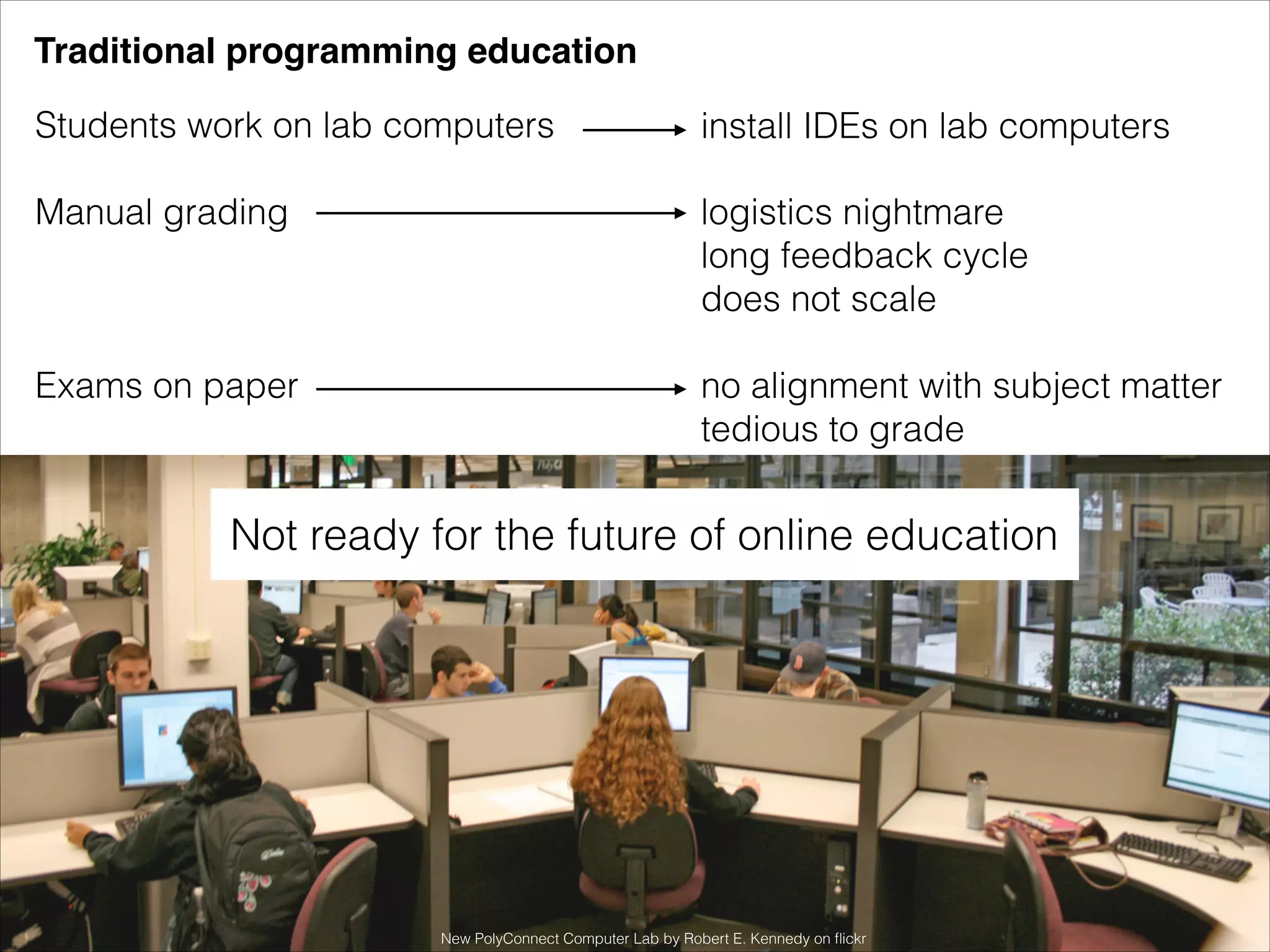 The document discusses the challenges of traditional programming education, including manual grading and misalignment with modern educational needs. It presents a new browser-based programming environment that offers automatic grading, secure execution, and analytics for better learning outcomes. Future work is needed to enhance the platform's features and increase adoption.