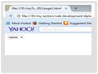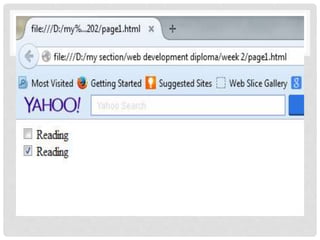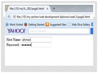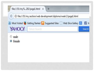 The document provides an introduction to basic HTML elements for creating forms and web pages. It explains key elements such as <html>, <head>, <title>, <body>, and how to add images, links, and comments. It also covers different form controls like text boxes, checkboxes, radio buttons, drop-down menus, and buttons. The document demonstrates how to group related form elements using <fieldset> and <legend> and how to add labels and text areas. It concludes with a brief description of the <div> element to group and style blocks of content.