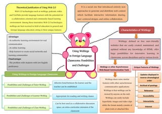The document discusses using weblogs in foreign language classrooms and their benefits and challenges. It outlines that weblogs provide opportunities for collaboration, community-based learning and user-generated content. Specifically, weblogs allow for reverse chronological posting of updates, archiving of posts, and interactivity. However, their use also presents challenges, such as difficulties for students with low English proficiency. Overall, the document analyzes how weblogs can serve as authentic learning environments for real communication and online learning if implemented effectively in foreign language classrooms.