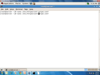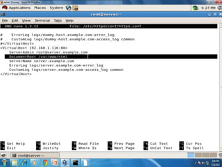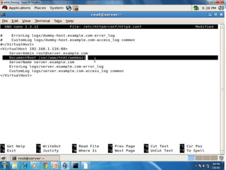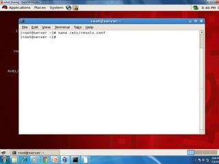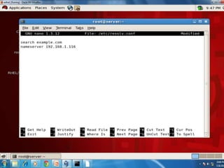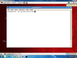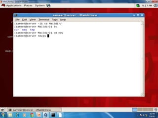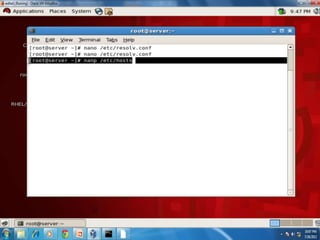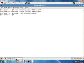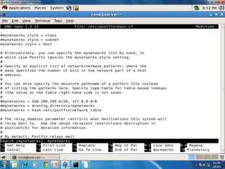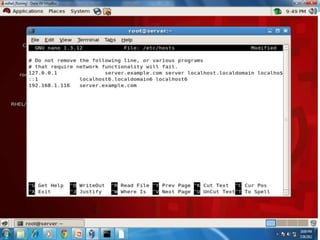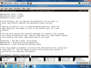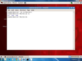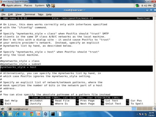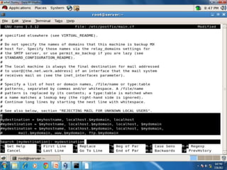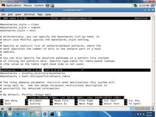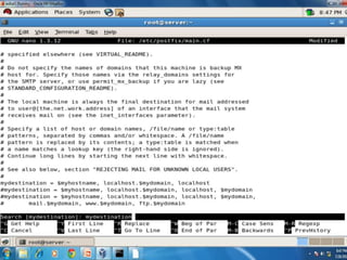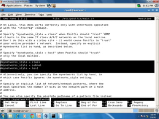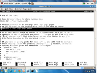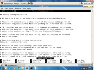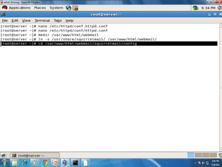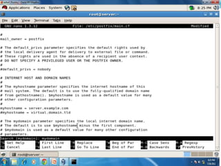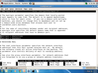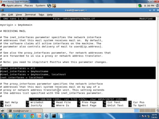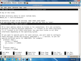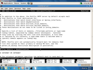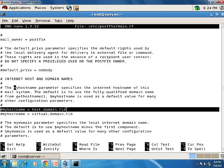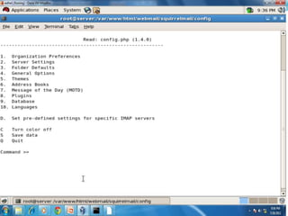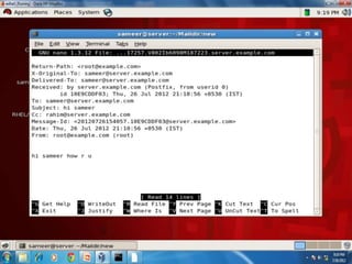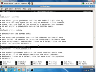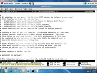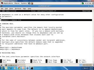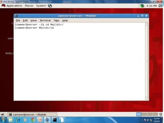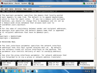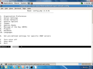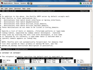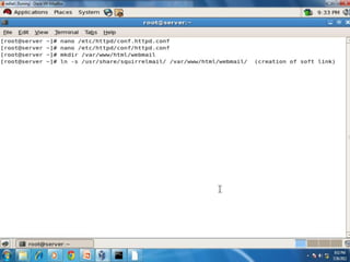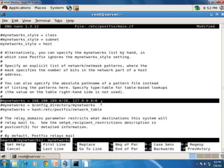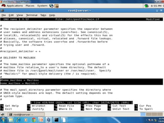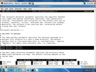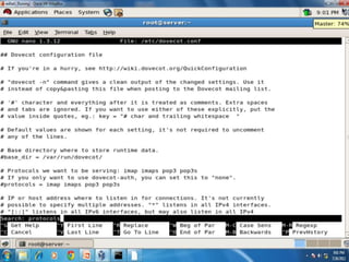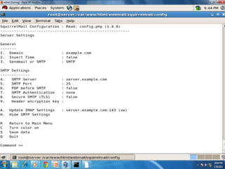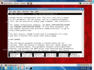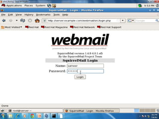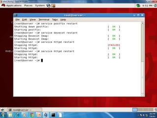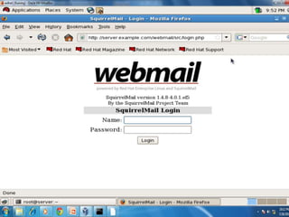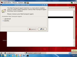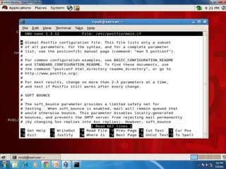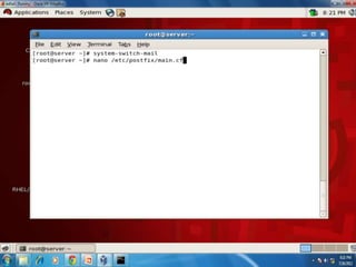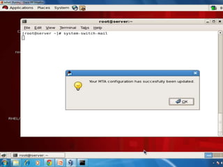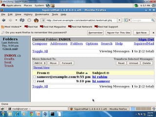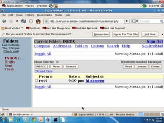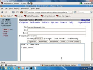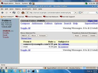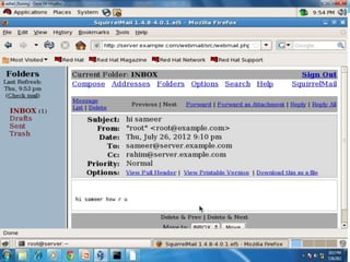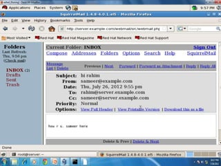 This document provides instructions for configuring a mail server on Red Hat Linux. It describes installing Postfix as the mail transfer agent (MTA), configuring Dovecot for POP3 and IMAP access, creating user accounts, sending a test email between users, and configuring the SquirrelMail webmail interface. Key steps include installing system-switch-mail-gnome, restarting Postfix and setting it to start on boot, configuring Dovecot, adding users, sending an email from the root user to a new user, and configuring SquirrelMail's SMTP and server settings.