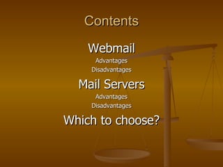 Webmail allows access to email from any computer with an internet browser but requires an internet connection. Mail clients are installed on personal computers, don't require an internet connection but can only be accessed from that computer. Webmail is accessible from anywhere but uses more bandwidth for attachments while mail clients allow customization but take up hard drive space. The best option depends on individual needs - webmail is best for accessibility while mail clients are better for personal computer use.