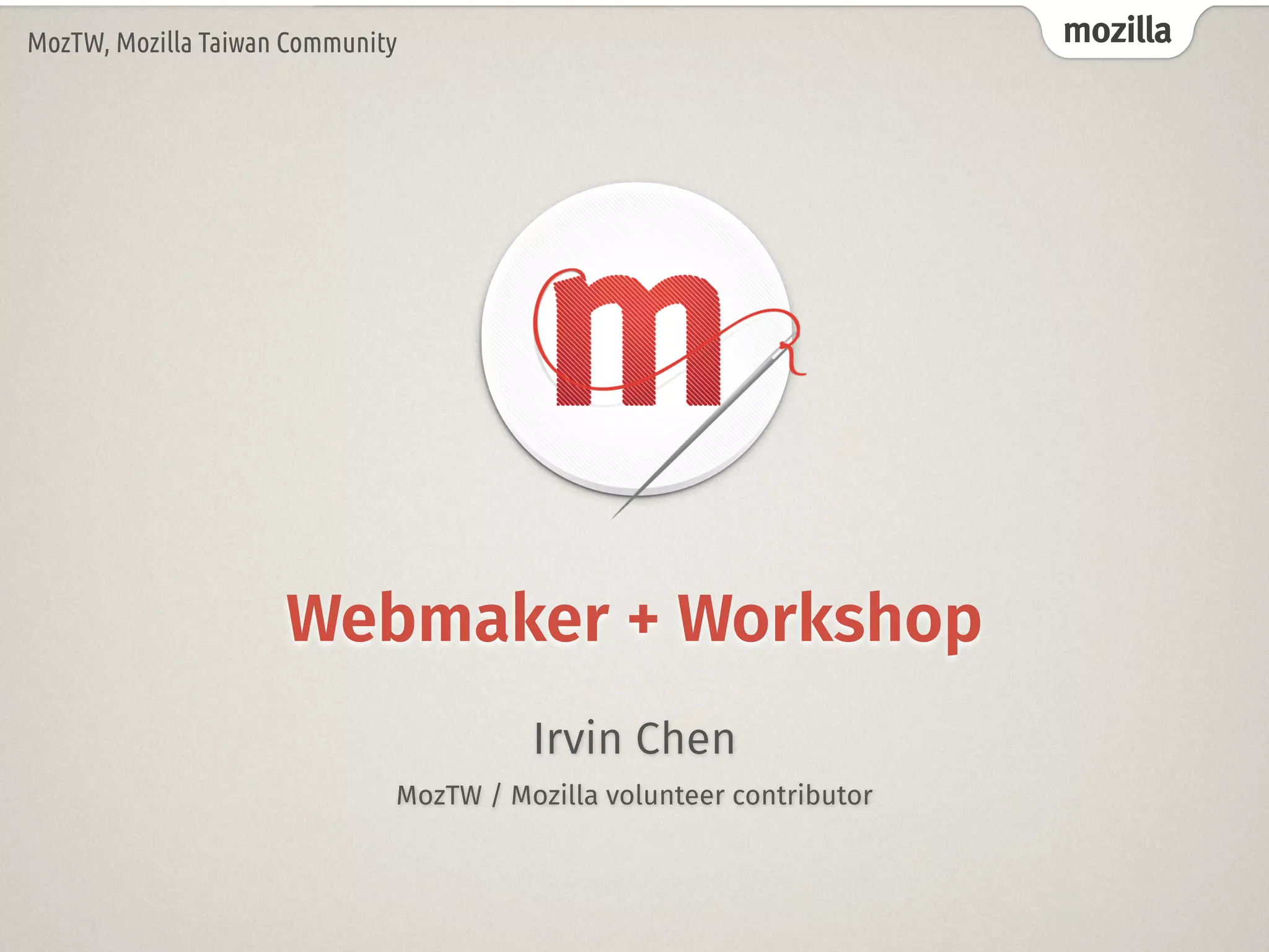This document discusses Mozilla and its Webmaker program. It introduces Irvin Chen, a Mozilla volunteer contributor who works on Webmaker and workshops. It describes how Webmaker provides tools like X-Ray Goggles, Thimble, Popcorn Maker, and Appmaker to help people learn skills like coding, designing, and sharing online. It emphasizes the importance of ideas, tools, community, digital literacy, making content, remixing existing work, earning badges, and having events like mentorship, hives, and maker parties. The overall goal is to move people from just consuming online to actively creating and participating on the web.