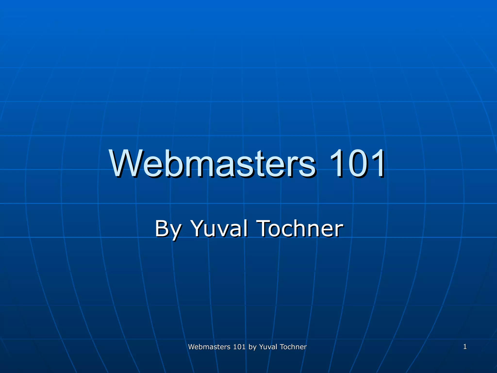This document provides an overview of topics for webmasters, including domain registration, web design, web programming, web hosting, e-commerce, search engines, pay-per-click advertising, Alexa analytics, and affiliate networks. It discusses choosing a domain name and registrar, options for web design like templates and content management systems, client-side and server-side programming, shared vs dedicated hosting, setting up an online storefront, search engine optimization, Google AdWords, using Alexa for site analytics, and popular affiliate networks.